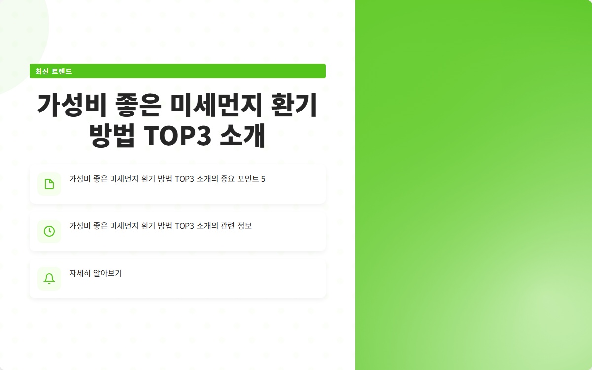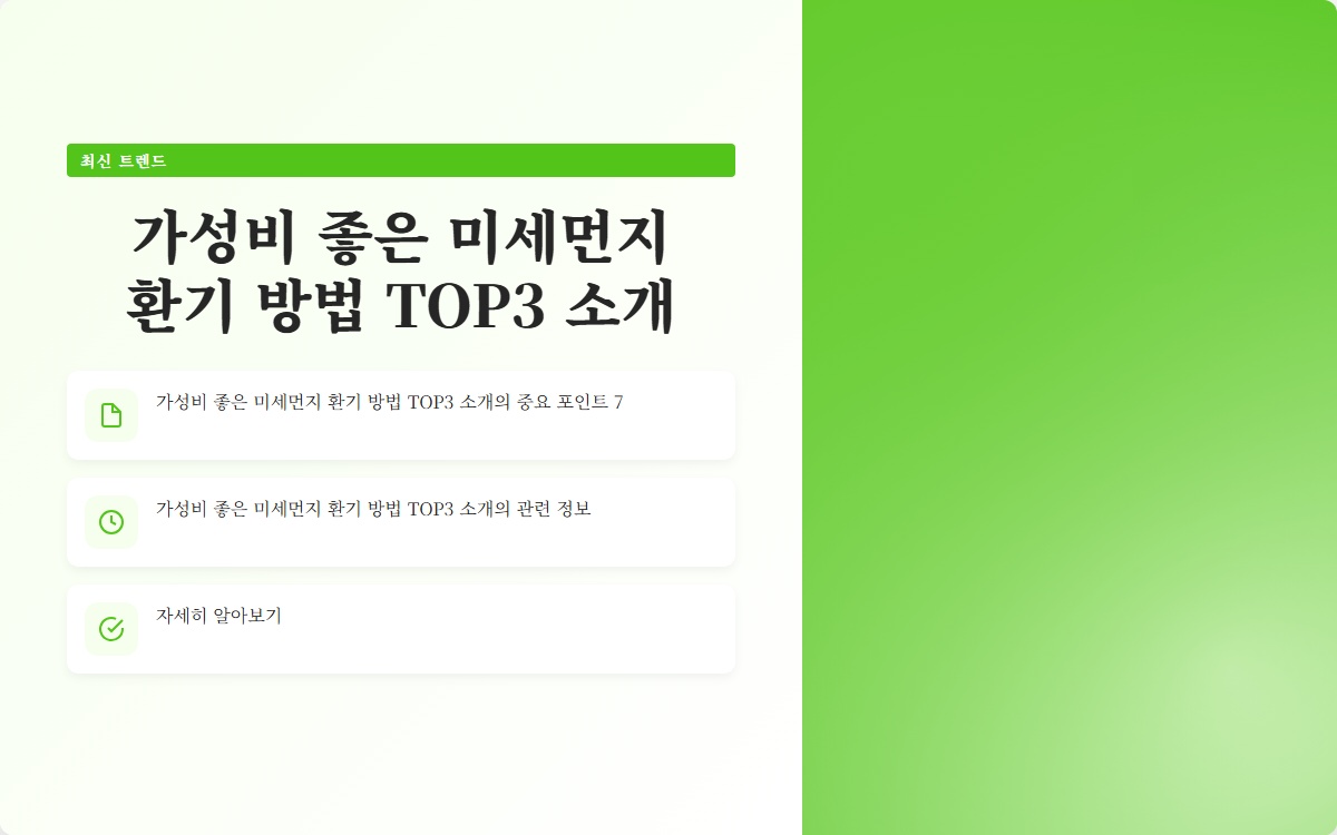 미세먼지는 현대 사회에서 점점 더 심각한 문제로 대두되고 있습니다. 미세먼지 환기 효과를 극대화하기 위해 많은 사람들이 다양한 방법을 찾고 있습니다. 이 글에서는 가성비 좋은 미세먼지 환기 방법 TOP3를 소개하여 실생활에서 쉽게 적용할 수 있는 방법을 제안하겠습니다. 이를 통해 보다 쾌적하고 건강한 환경을 만드는 데 도움を 줄 수 있기를 바랍니다.