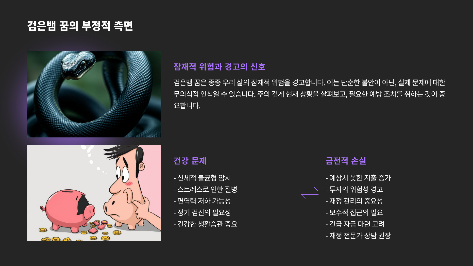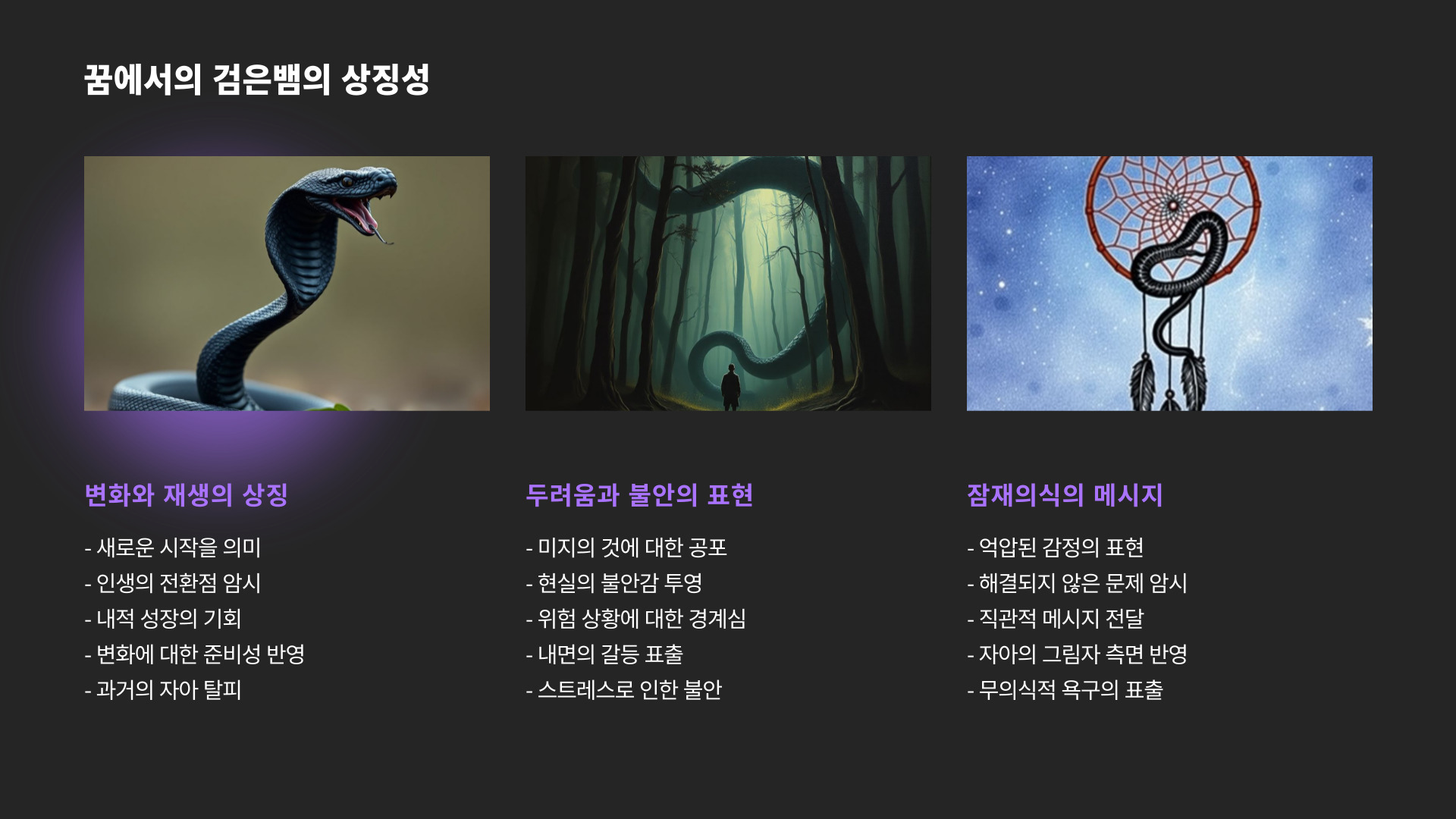 Tags: 꿈 해몽, 검은뱀 꿈, 꿈의 의미, 위험 신호, 불안, 심리적 분석, 내면 탐구, 긍정적 변화, 꿈 상담, 꿈 해석