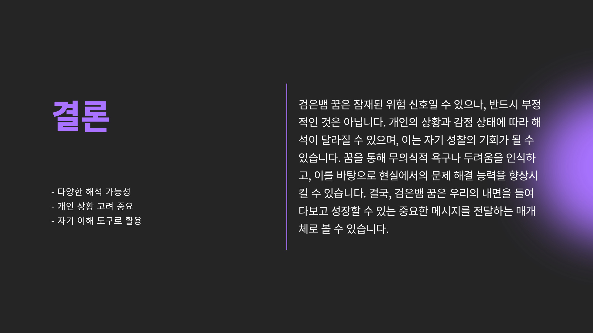 검은 뱀 꿈은 다양한 의미를 지니며, 주의가 필요한 상황을 나타내는 신호일 수 있습니다. 꿈에서 느낀 감정과 상황을 깊이 있게 분석하고, 그에 대한 대처 방법을 모색하는 것이 중요합니다. 꿈은 단순한 상상이 아닌, 우리 내면의 목소리를 반영하는 중요한 요소이기 때문입니다. 따라서, 검은 뱀 꿈을 꾸었다면 이를 기회로 삼아 자신의 감정을 탐구하고, 필요한 변화를 시도해보는 것이 좋습니다. 꿈을 통해 얻은 메시지가 당신의 삶에 긍정적인 변화를 가져오길 바랍니다.