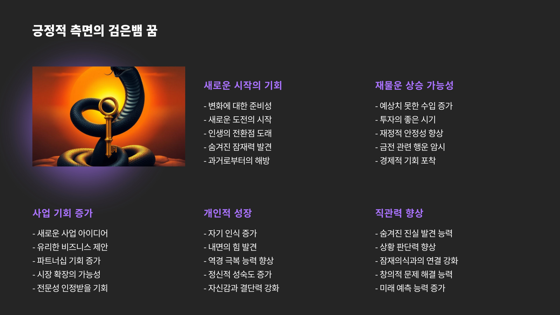 Tags: 꿈 해몽, 검은뱀 꿈, 꿈의 의미, 위험 신호, 불안, 심리적 분석, 내면 탐구, 긍정적 변화, 꿈 상담, 꿈 해석