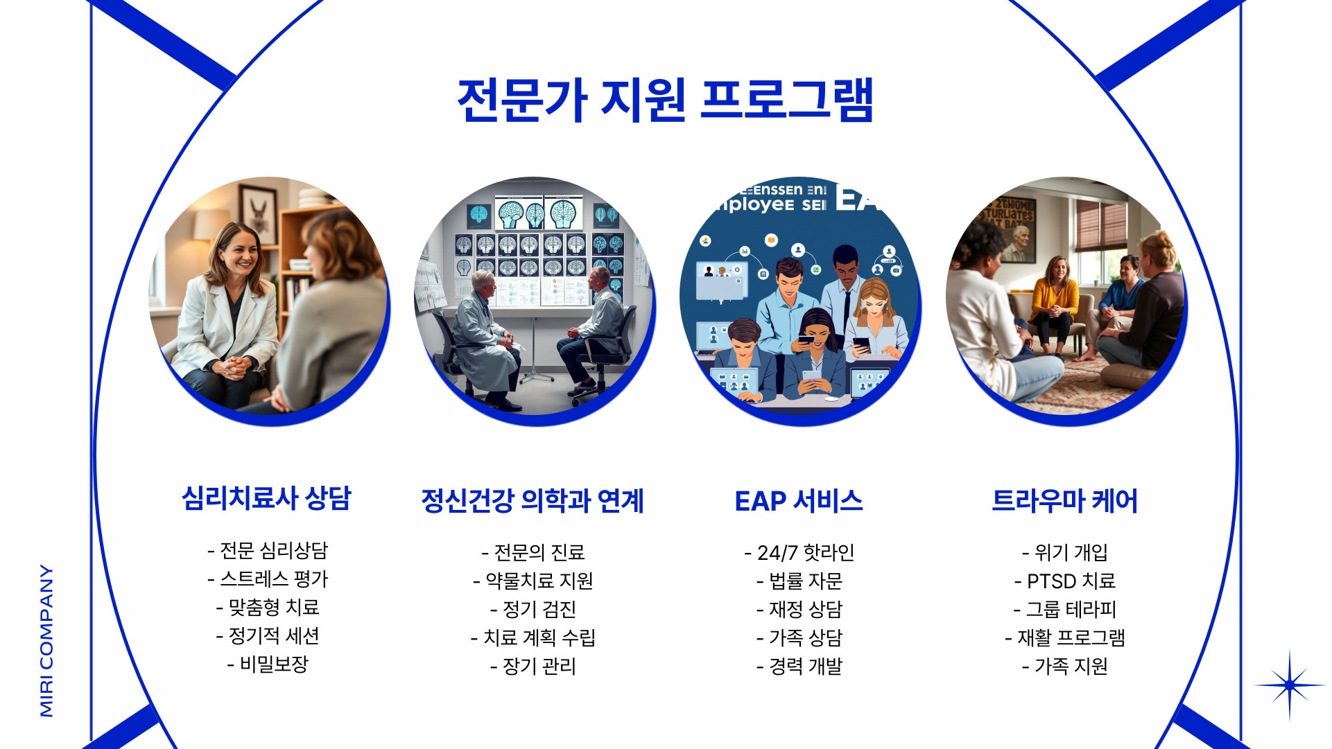 | 워크숍 | 스트레스 관리 및 갈등 해결을 위한 다양한 교육 프로그램을 제공합니다. |