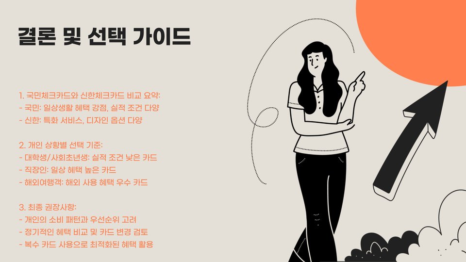 두 카드의 혜택을 비교해보면, 국민체크카드는 안정성과 접근성에서 강점을 보이는 반면, 신한체크카드는 다양한 제휴 할인과 포인트 적립에서 우위를 점하고 있습니다. 따라서, 개인의 소비 패턴에 따라 선택하는 것이 중요합니다. 예를 들어, 자주 외식을 하거나 쇼핑을 즐기는 소비자는 신한체크카드의 혜택을 더 많이 누릴 수 있을 것입니다. 반면, 안정적인 서비스와 실시간 관리가 필요한 사람은 국민체크카드가 더 적합할 수 있습니다.