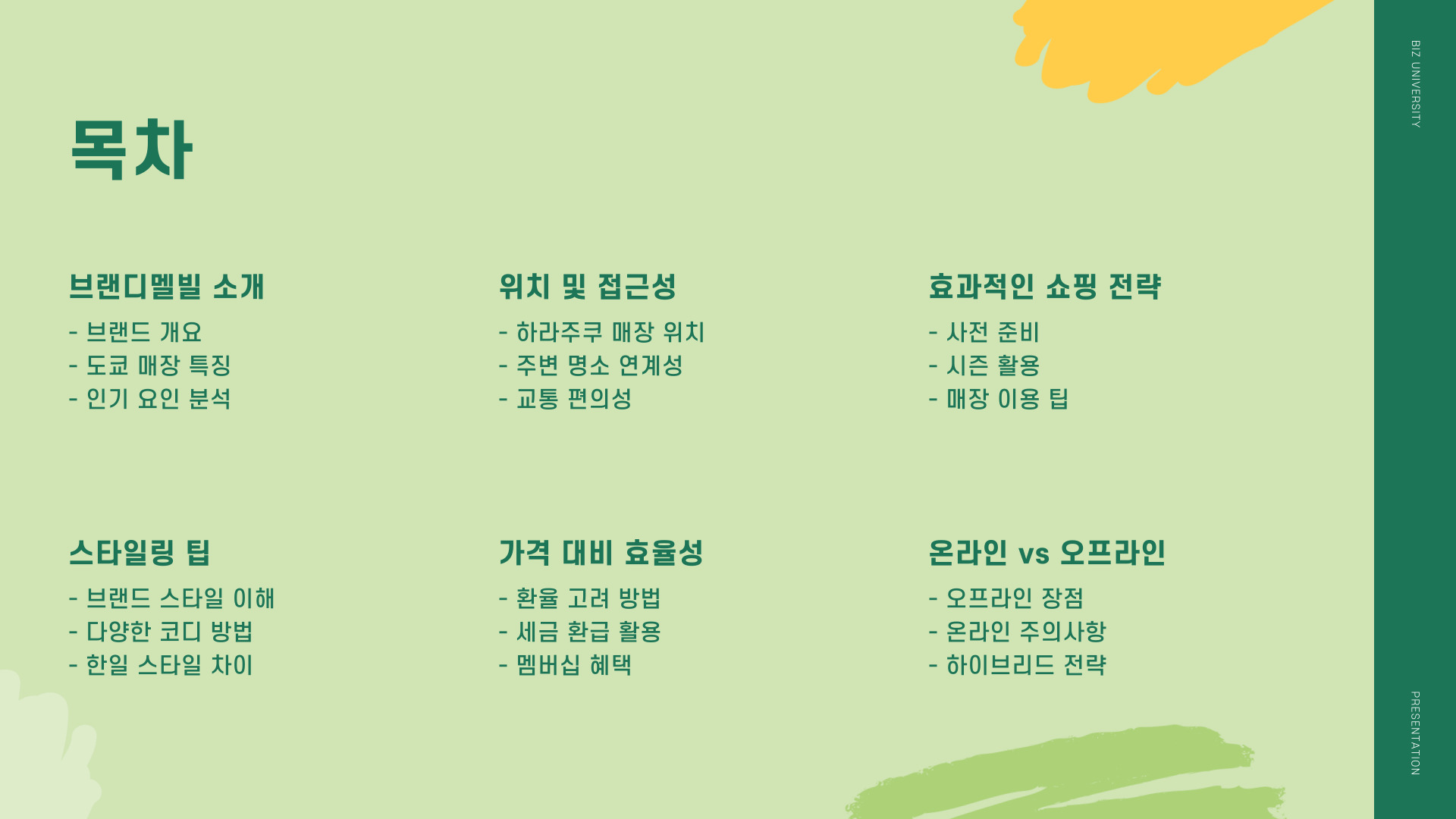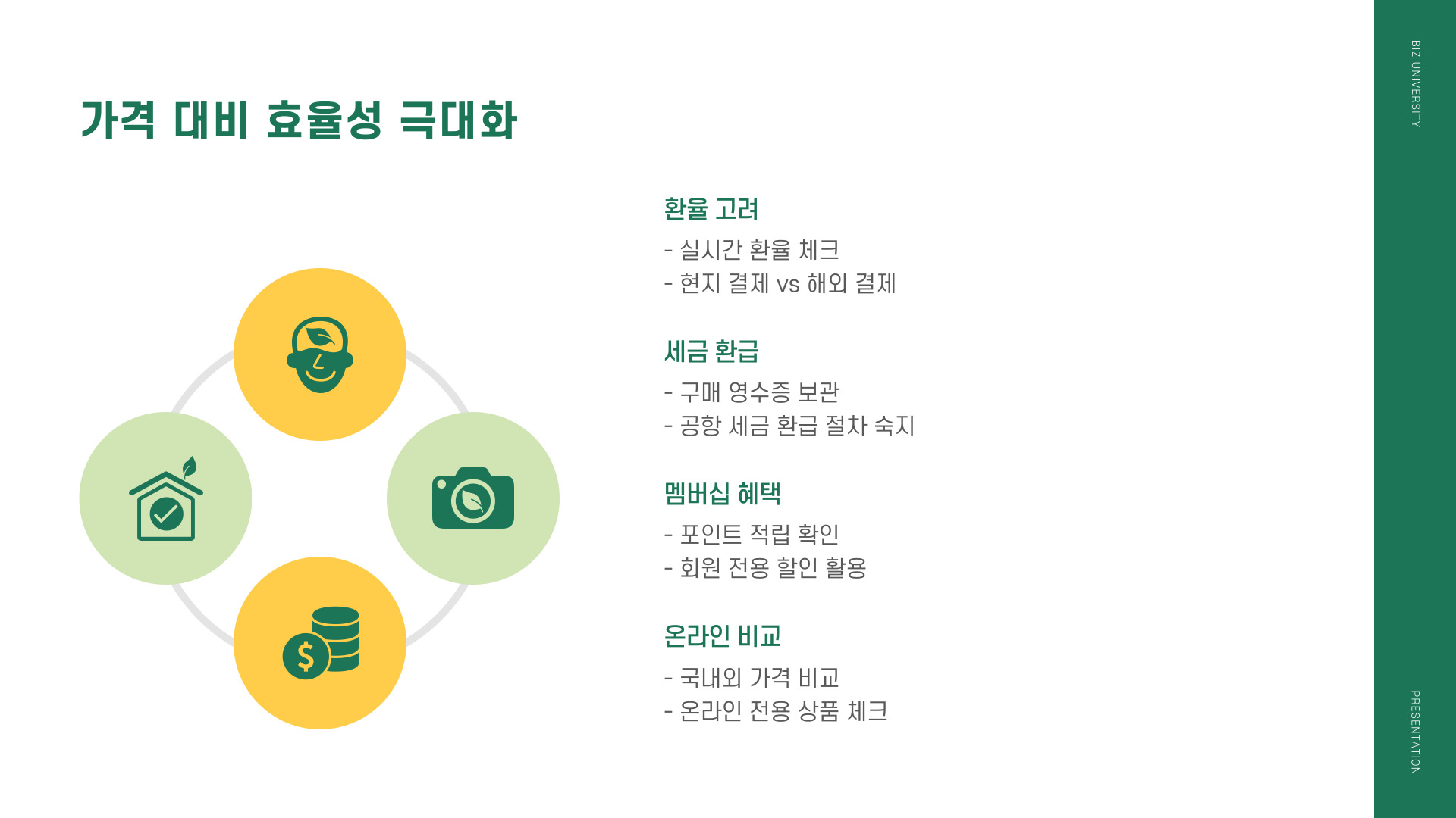 | 쇼핑 | 세일 기간을 활용하고, 현지 브랜드에 투자하세요. |