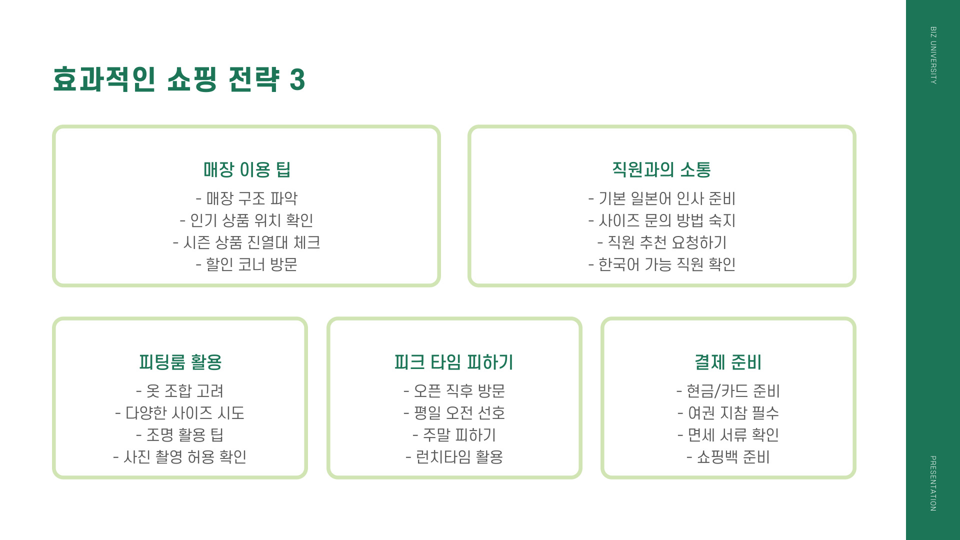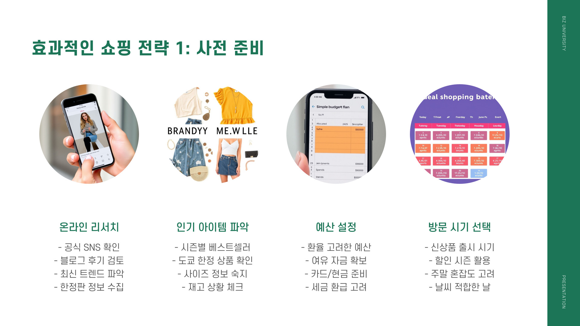| 쇼핑 | 세일 기간을 활용하고, 현지 브랜드에 투자하세요. |