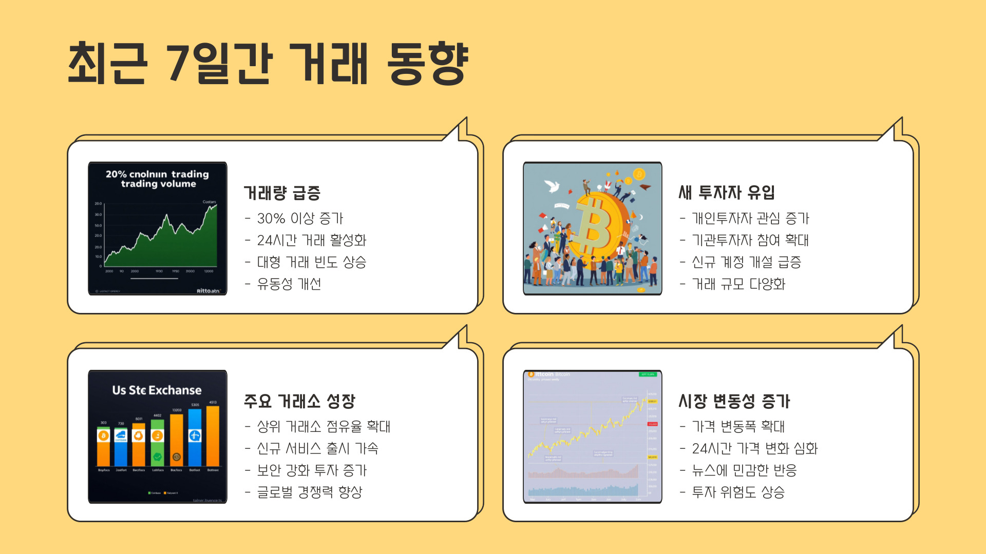 최근 7일 동안 미국 비트코인 거래소에서는 거래량이 급증했습니다. 이는 다양한 요인에 의해 영향을 받았는데, 특히 경제적 불확실성과 인플레이션 우려가 주요 원인으로 작용했습니다. 투자자들은 비트코인을 안전 자산으로 인식하게 되었으며, 이로 인해 거래소의 활동이 활발해졌습니다.