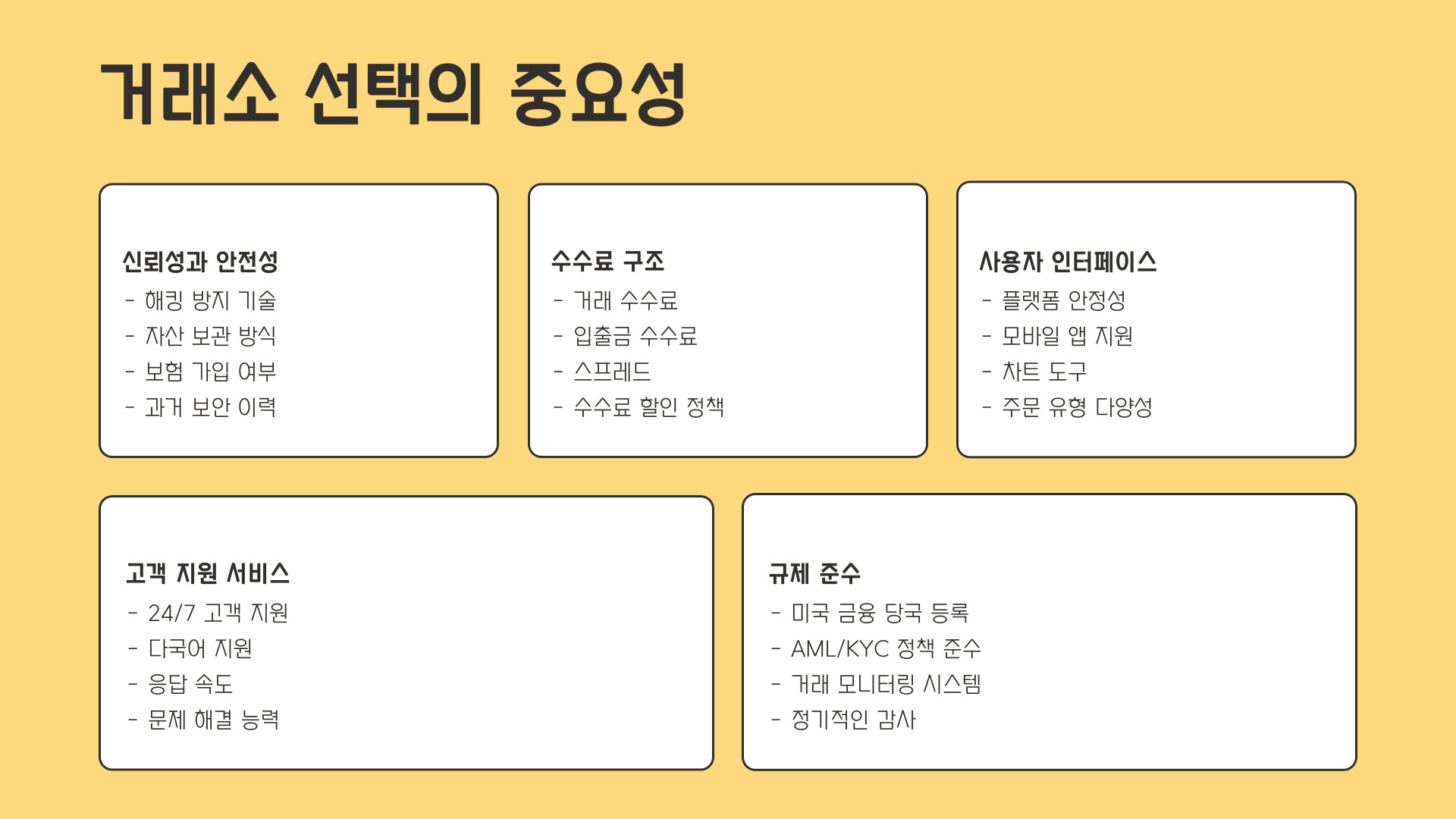 - 거래소 선택 시 보안 및 수수료 고려 필요
