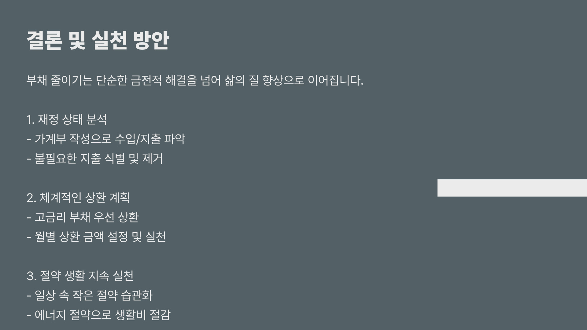 부채 문제를 해결하기 위해서는 먼저 자신의 재정 상태를 정확히 분석하고, 체계적인 상환 계획을 세우며, 절약 생활을 실천하는 것이 필요합니다. 이러한 과정은 단순히 부채를 줄이는 것뿐만 아니라, 재정적 독립과 안정적인 삶을 영위하는 데 큰 도움이 됩니다.