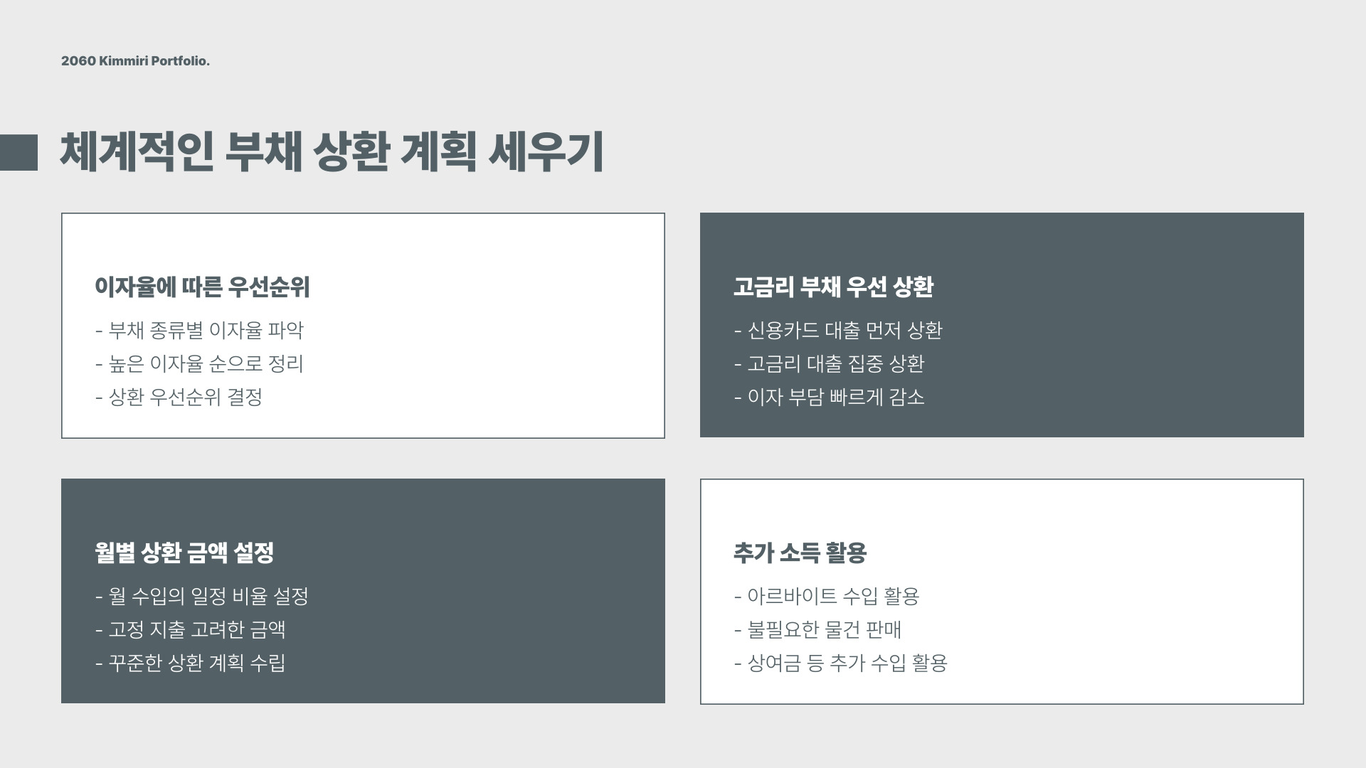 부채가 여러 개일 경우, 통합하는 방법도 효과적입니다. 채무 통합은 여러 개의 부채를 하나로 합쳐 관리하는 방식으로, 이자율이 높은 채무부터 낮은 채무로 통합할 수 있습니다. 이를 통해 월 지불액을 줄이고 관리가 더 용이해질 수 있습니다.