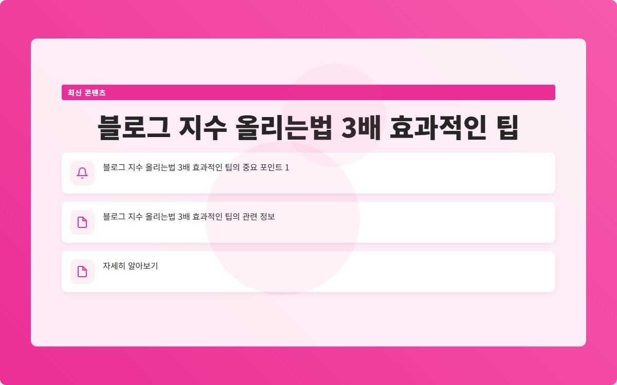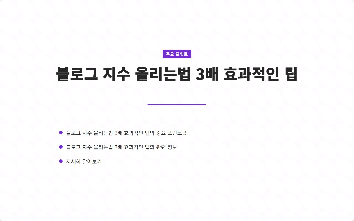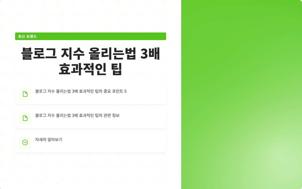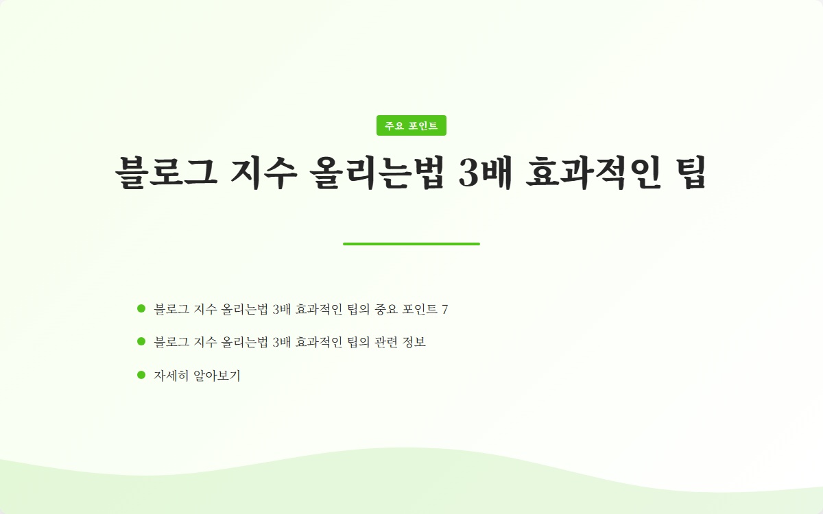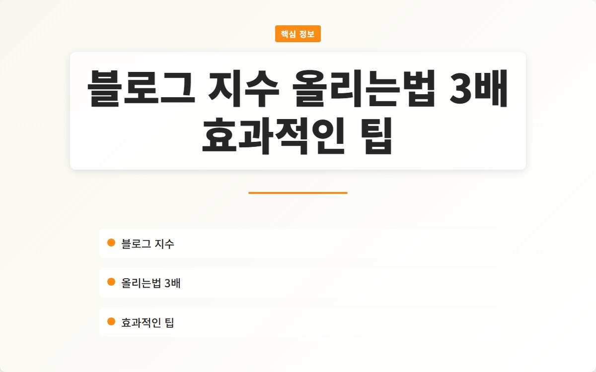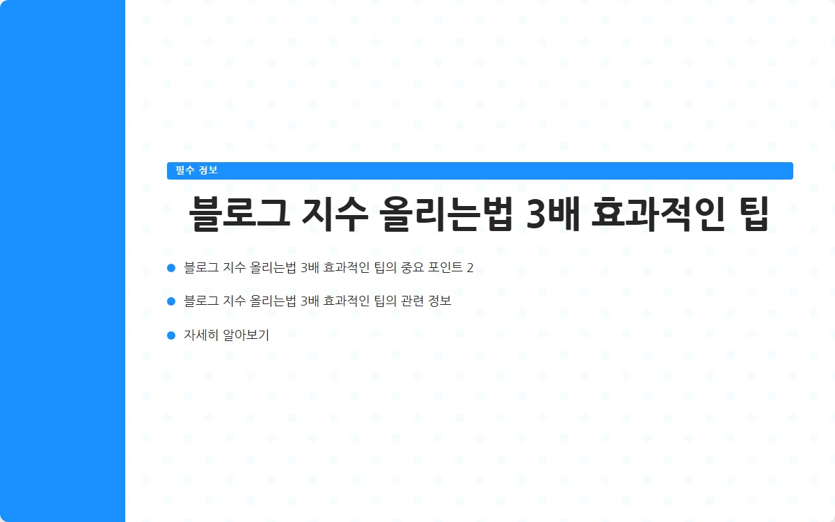 블로그 지수 올리는법을 위해서는 꾸준한 포스팅, 독창적인 내용, 효과적인 키워드 사용이 중요합니다. 지금부터 실천해보세요!