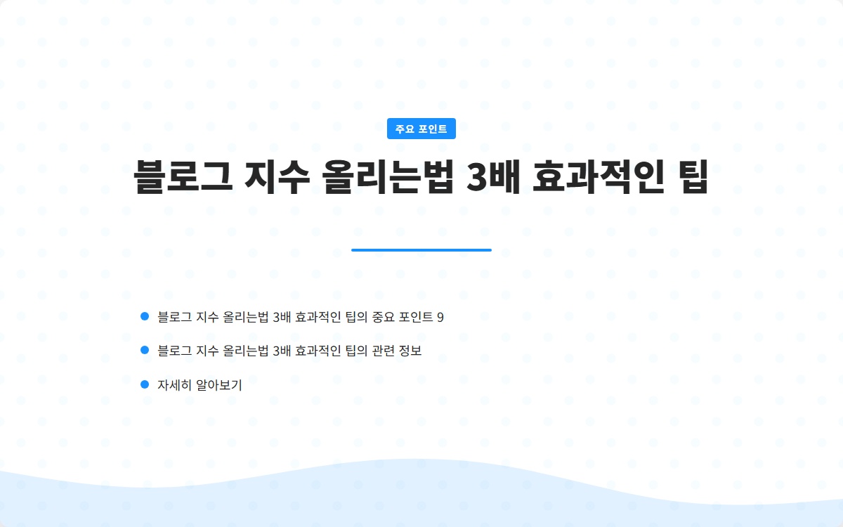 블로그 지수 올리는법을 위해서는 꾸준한 포스팅, 독창적인 내용, 효과적인 키워드 사용이 중요합니다. 지금부터 실천해보세요!