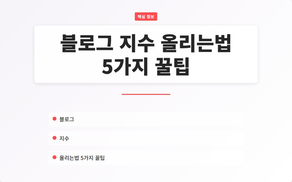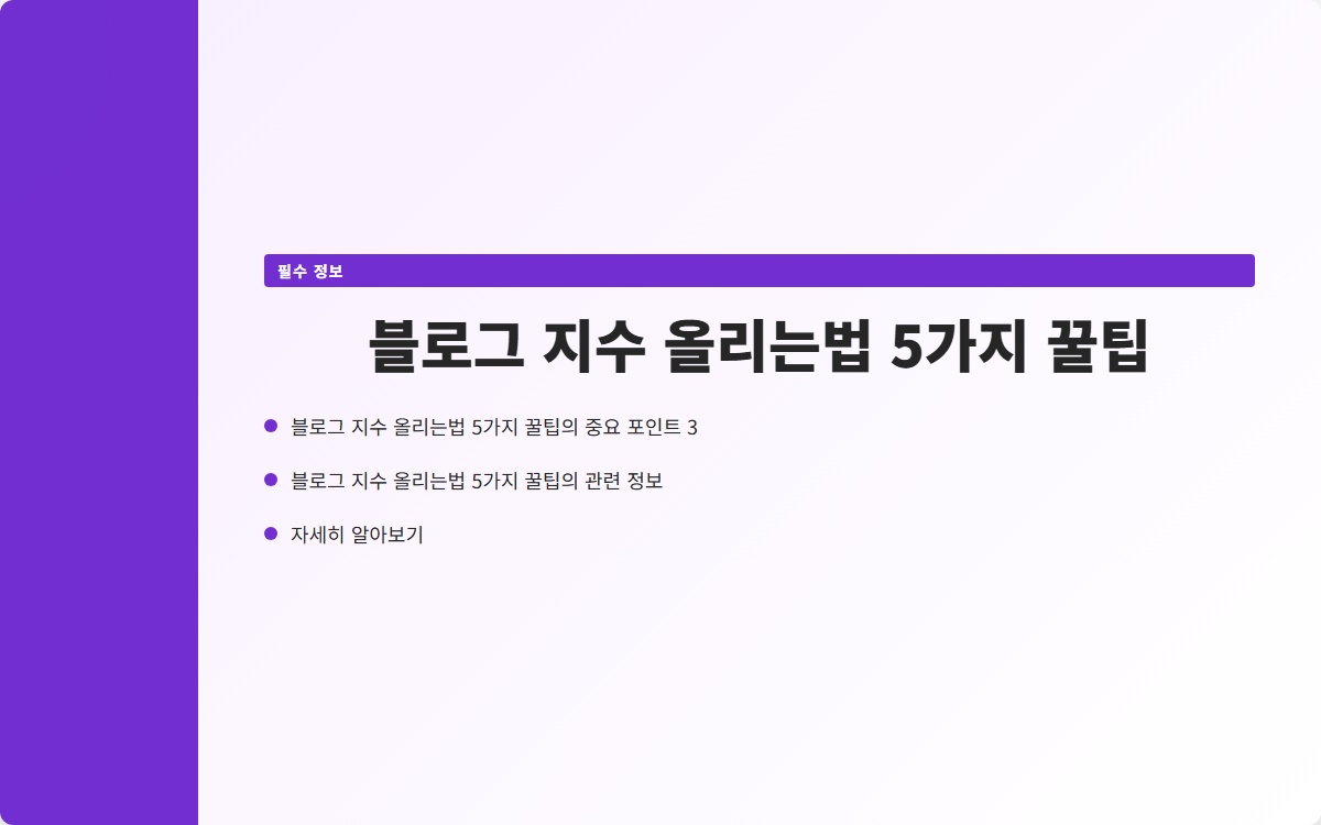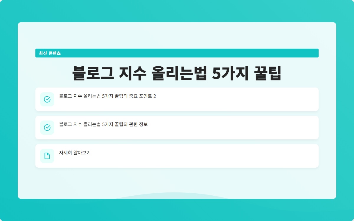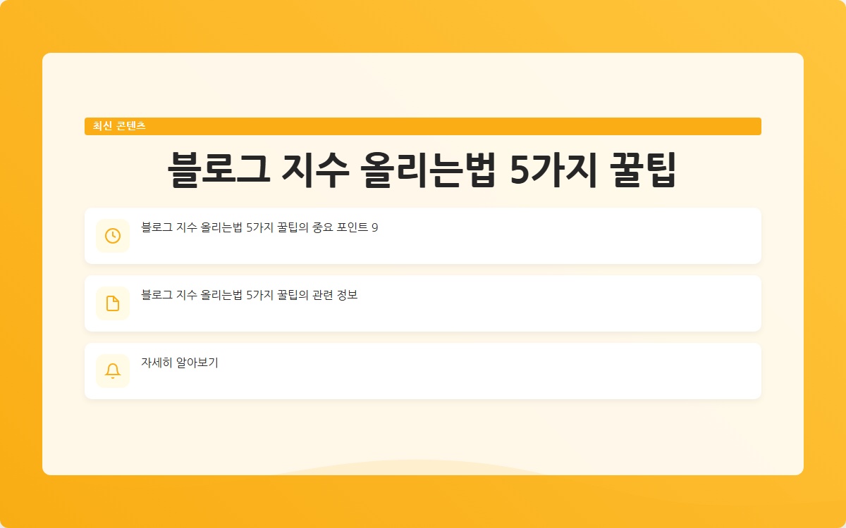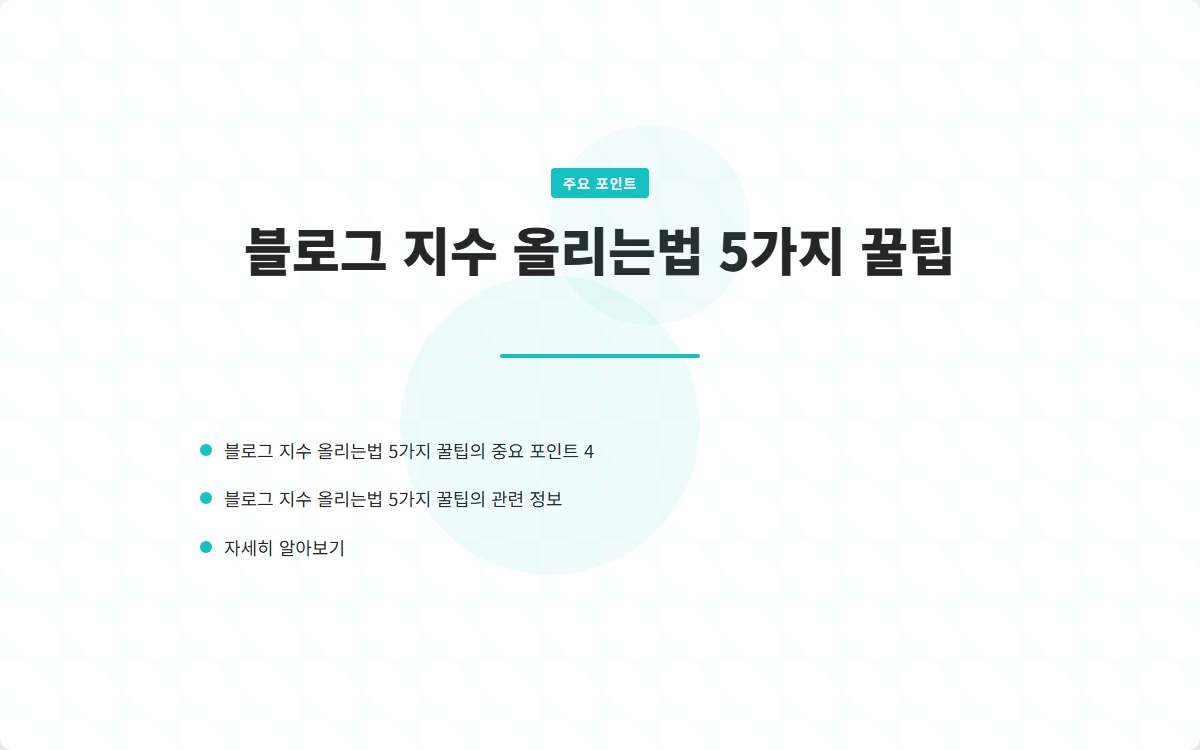 블로그 지수를 올리기 위한 다섯 가지 꿀팁을 통해 검색 엔진 최적화를 하고 더 많은 방문자를 유도할 수 있습니다. 블로그 운영에 필요한 다양한 정보와 도구를 활용하세요. 지금 시작해 보세요!