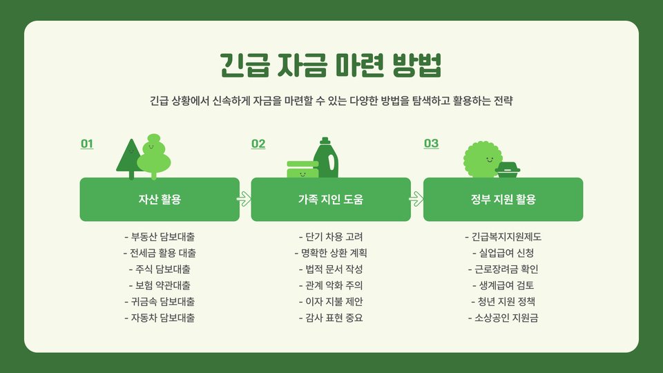 둘째로, 다양한 대출 상품을 활용하여 급한 상황에서 필요한 자금을 조기에 확보할 수 있도록 준비해야 합니다. 예를 들어, 사채보다는 낮은 이자율의 대출 상품을 선택하는 것이 재정적으로 유리합니다.