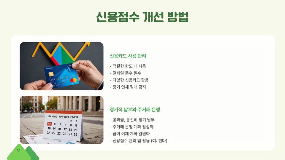 다음으로, 적절한 개선 방안을 마련해야 합니다. 신용 점수가 낮다면 지출을 줄이거나 부채를 갚는 방법으로 점수를 올릴 수 있습니다. 신용 카드를 적절히 사용하여 점수를 관리하는 것도 좋은 방법입니다.