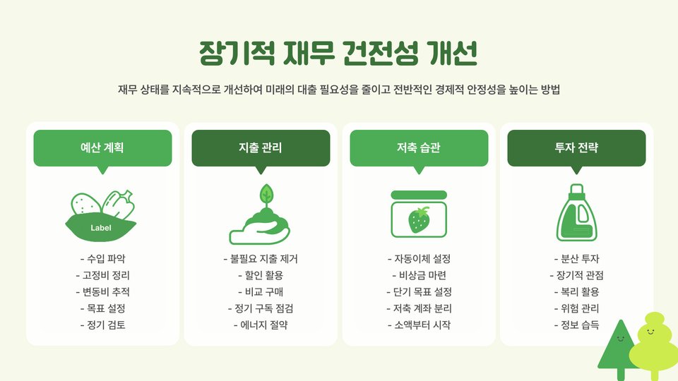셋째, 신용 점수를 향상시키기 위한 방법을 모색해야 합니다. 신용카드 사용 내역을 관리하고, 연체를 피하며, 다양한 금융 거래를 통해 신용 점수를 높일 수 있습니다. 마지막으로, 필요한 금액을 정확히 계산하여 과도한 대출을 피하는 것이 좋습니다.
