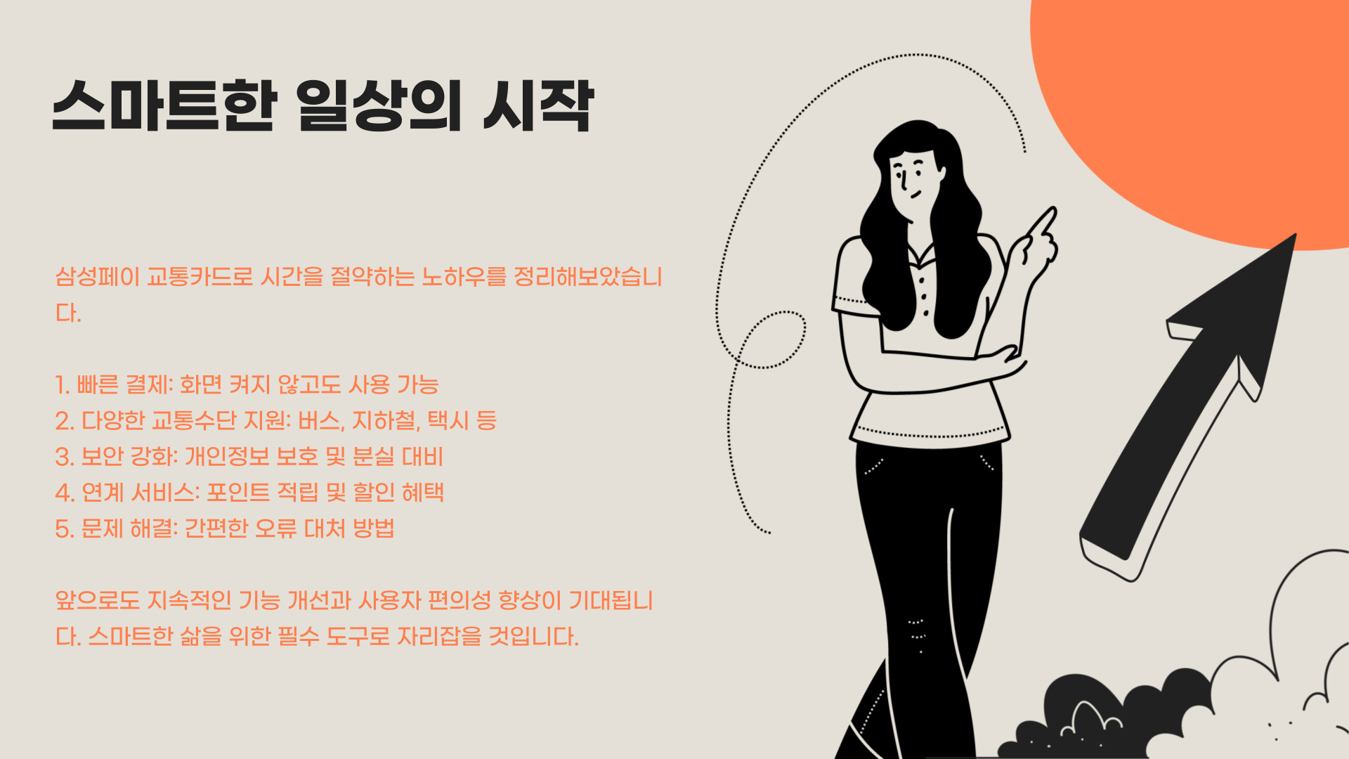 결론적으로, 삼성페이 교통카드는 현대 사회에서 시간을 절약하는 데 매우 유용한 도구입니다. 간편한 결제와 즉각적인 충전이 가능한 이 시스템을 통해 여러분의 일상이 더욱 효율적이 될 것입니다. 대중교통을 자주 이용하는 분들에게는 특히 추천할 만한 서비스입니다. 교통비를 절약하고, 시간을 아끼는 스마트한 선택이 되시길 바랍니다!