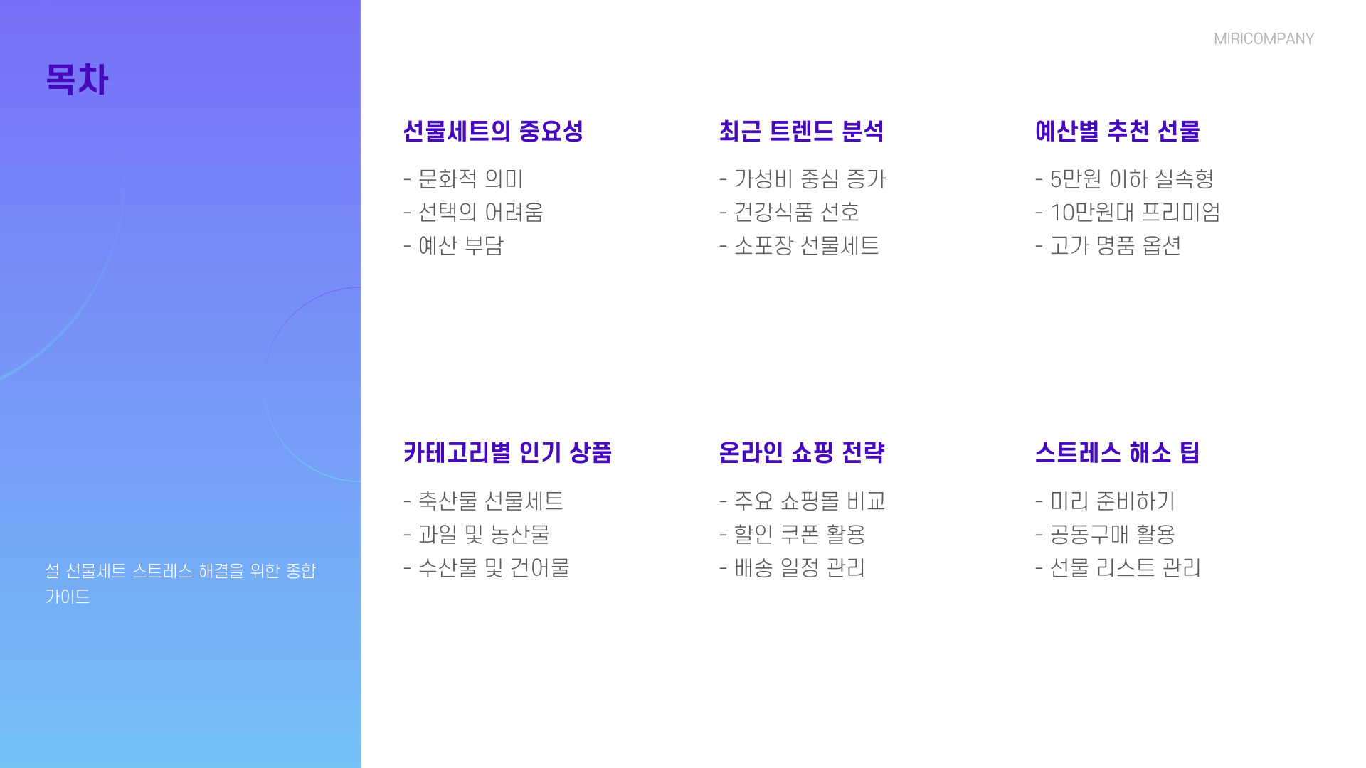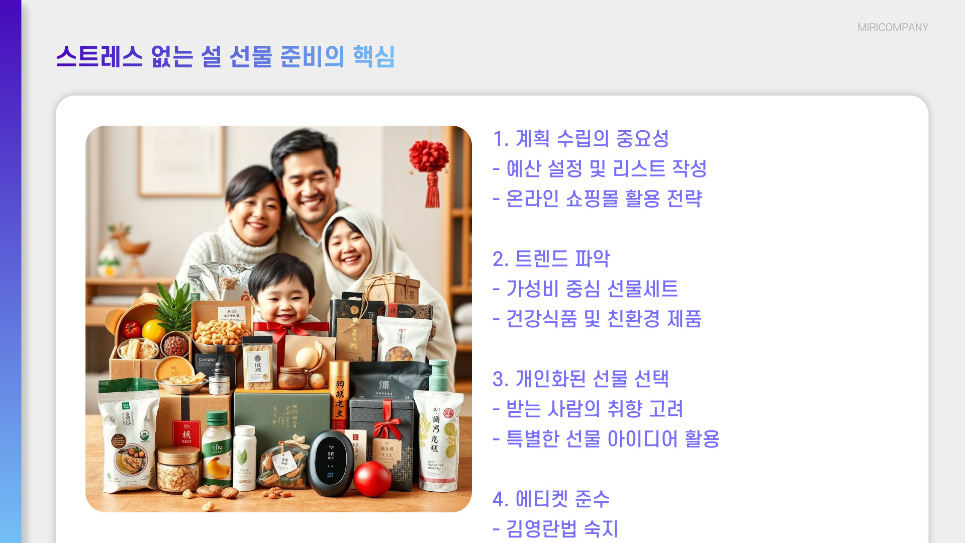 설 선물세트는 단순한 물건이 아닌, 마음을 전하는 중요한 수단입니다. 준비하는 과정에서 스트레스를 줄이기 위해는 계획적인 접근과 배려가 필요합니다. 기쁨이 가득한 설날을 맞이하기 위해, 선물 준비에 대한 스트레스를 최소화하고 즐거운 마음으로 설을 맞이하세요!