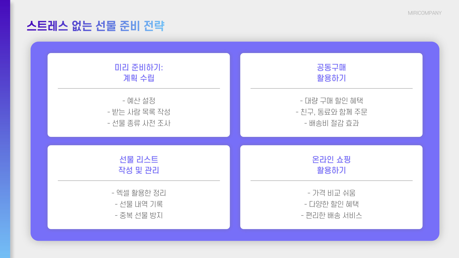 이 외에도 가족과 함께 선물 준비를 하거나, 서로의 아이디어를 나누는 시간을 가지는 것도 좋은 방법입니다. 이처럼 함께하는 시간은 소중한 추억이 되고, 혼자 고민하는 스트레스를 줄이는 데 도움이 됩니다.