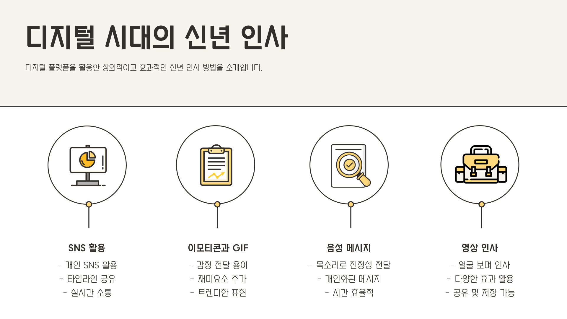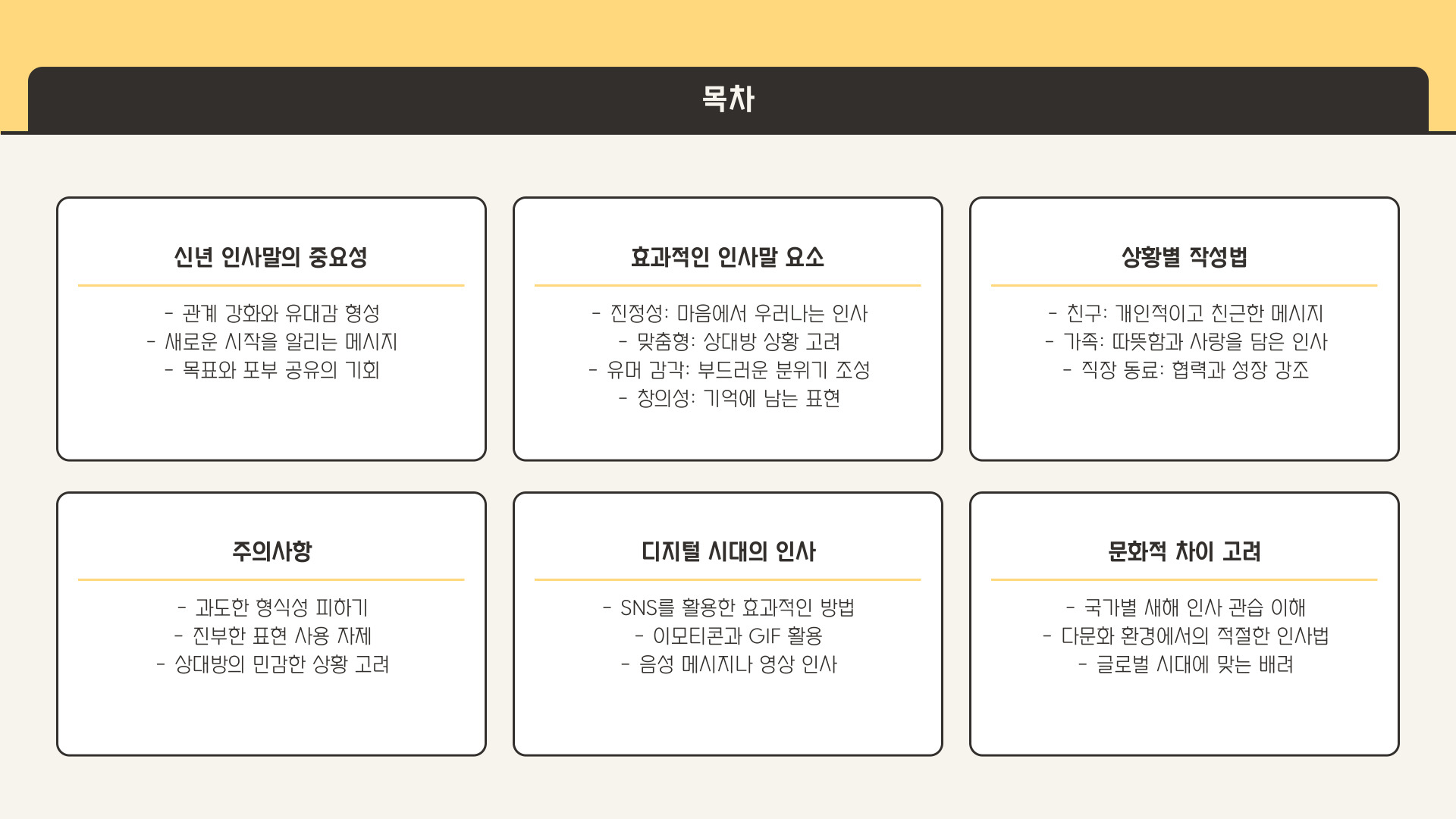 | 유머와 창의성 | 유머와 창의적인 표현으로 인사말을 독특하게 만들어 보세요. |