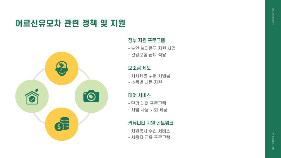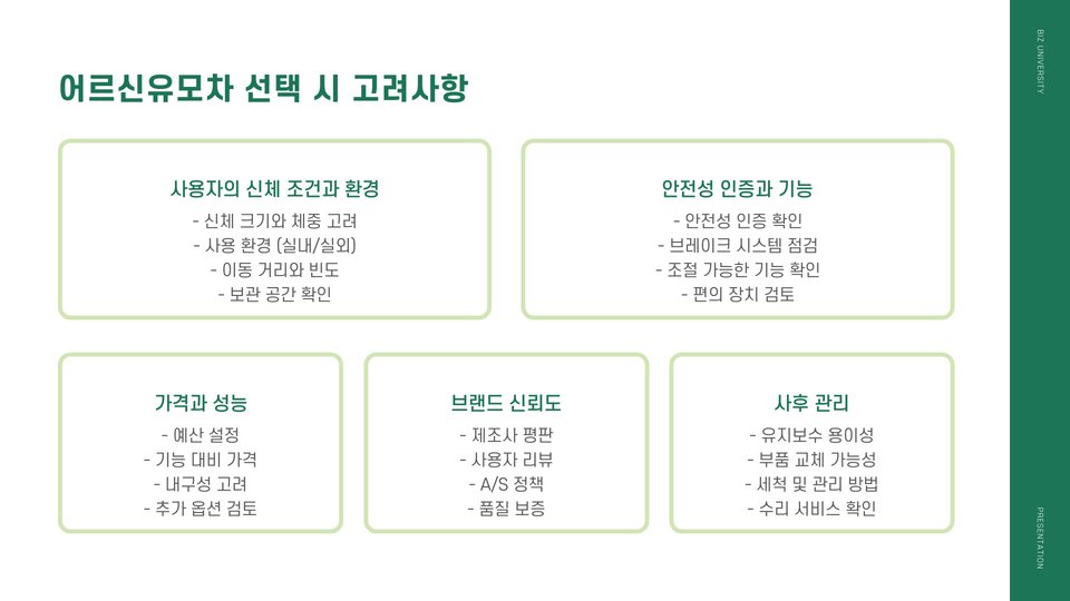 - 어르신유모차 선택 시 무게, 핸들 높이 조절 기능, 디자인을 고려해야 한다.