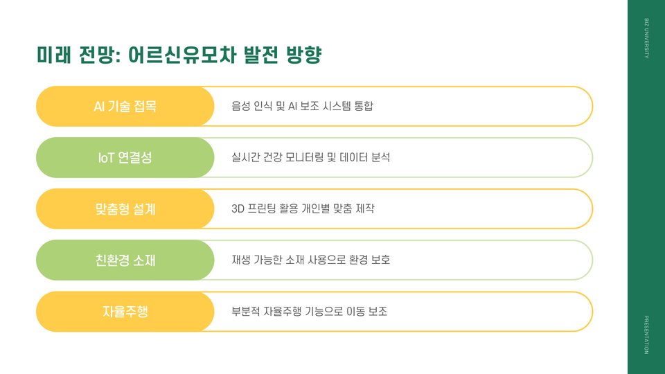 어르신유모차의 미래는 더욱 밝습니다. 기술의 발전으로 인해 다양한 기능들이 추가되고, 디자인이 더욱 세련되어지고 있습니다. 특히, 사회적 니즈를 반영한 다양한 제품이 등장하면서 노인들이 자립적으로 생활할 수 있는 환경이 만들어지고 있습니다. 이러한 트렌드는 우리 사회의 인식 변화와 함께 더욱 강화될 것입니다. 앞으로도 어르신유모차에 대한 지속적인 연구와 개발이 필요하며, 이를 통해 더 많은 어르신들이 안전하고 편리하게 외부 활동을 즐길 수 있는 날이 오기를 기대합니다.