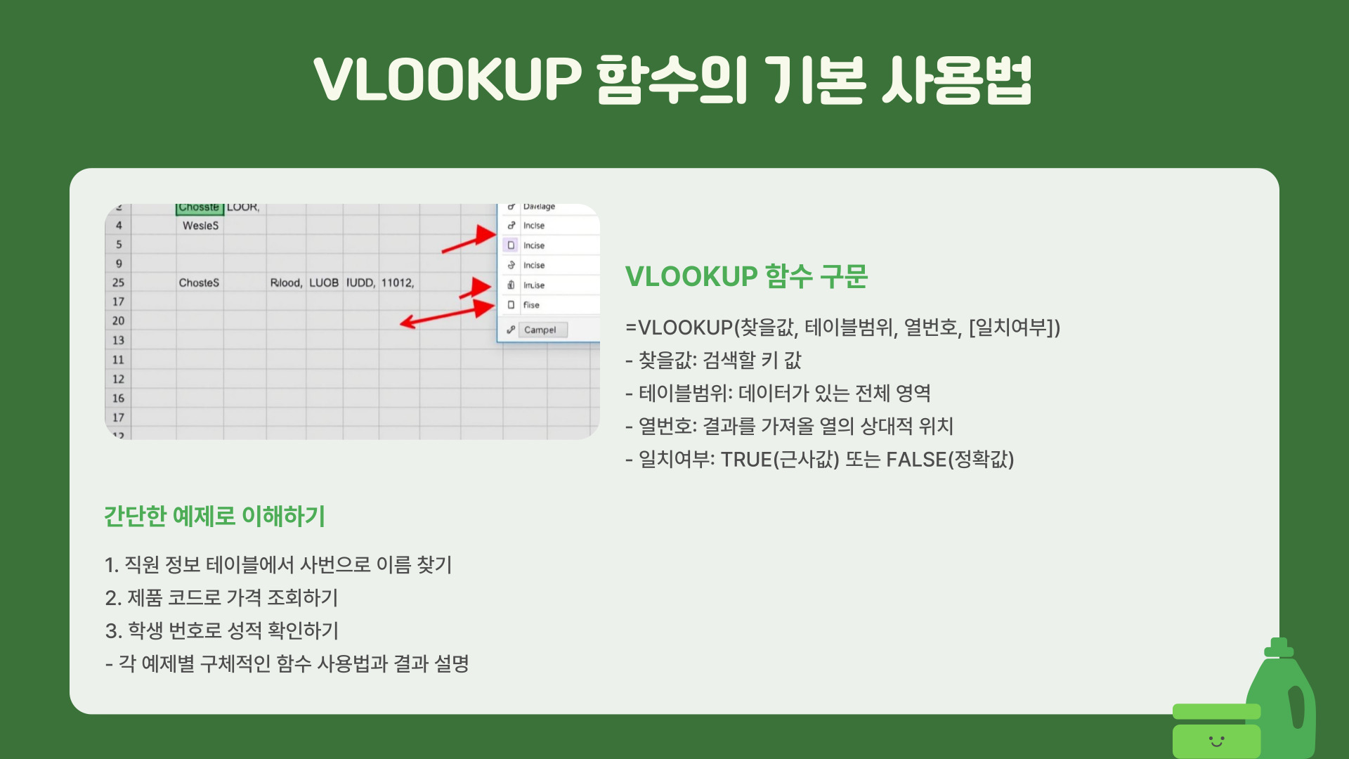 - 가장 기본적인 형태: =VLOOKUP(찾을 값, 테이블 범위, 반환할 열 번호, [정확히 일치 여부])