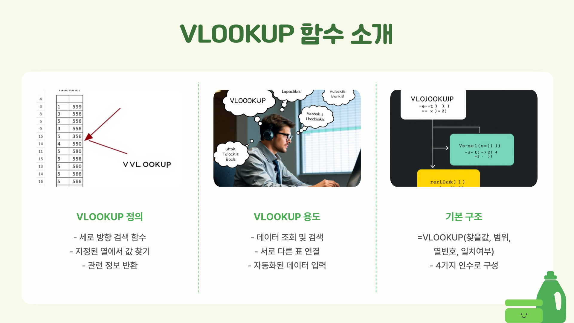 - 구문: =VLOOKUP(찾을 값, 데이터 범위, 열 번호, 정렬 방식)