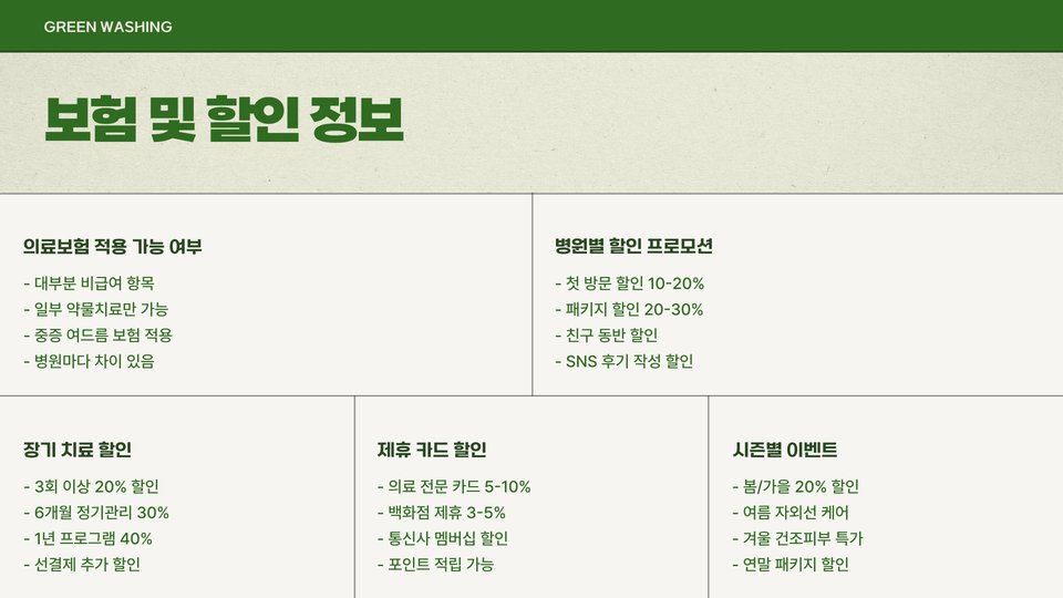 또한, 여러 병원을 방문하여 상담을 받아봄으로써 다양한 치료방법과 가격을 비교해보면 보다 나은 선택을 할 수 있습니다. 이 과정에서 얻은 정보는 피부과 치료의 최종 결정을 내리는 데 큰 도움이 될 것입니다. 결국 너무 저렴한 가격만을 추구하기보다는, 전문 의사의 조언과 경험을 바탕으로 판단하는 것이 바람직합니다.