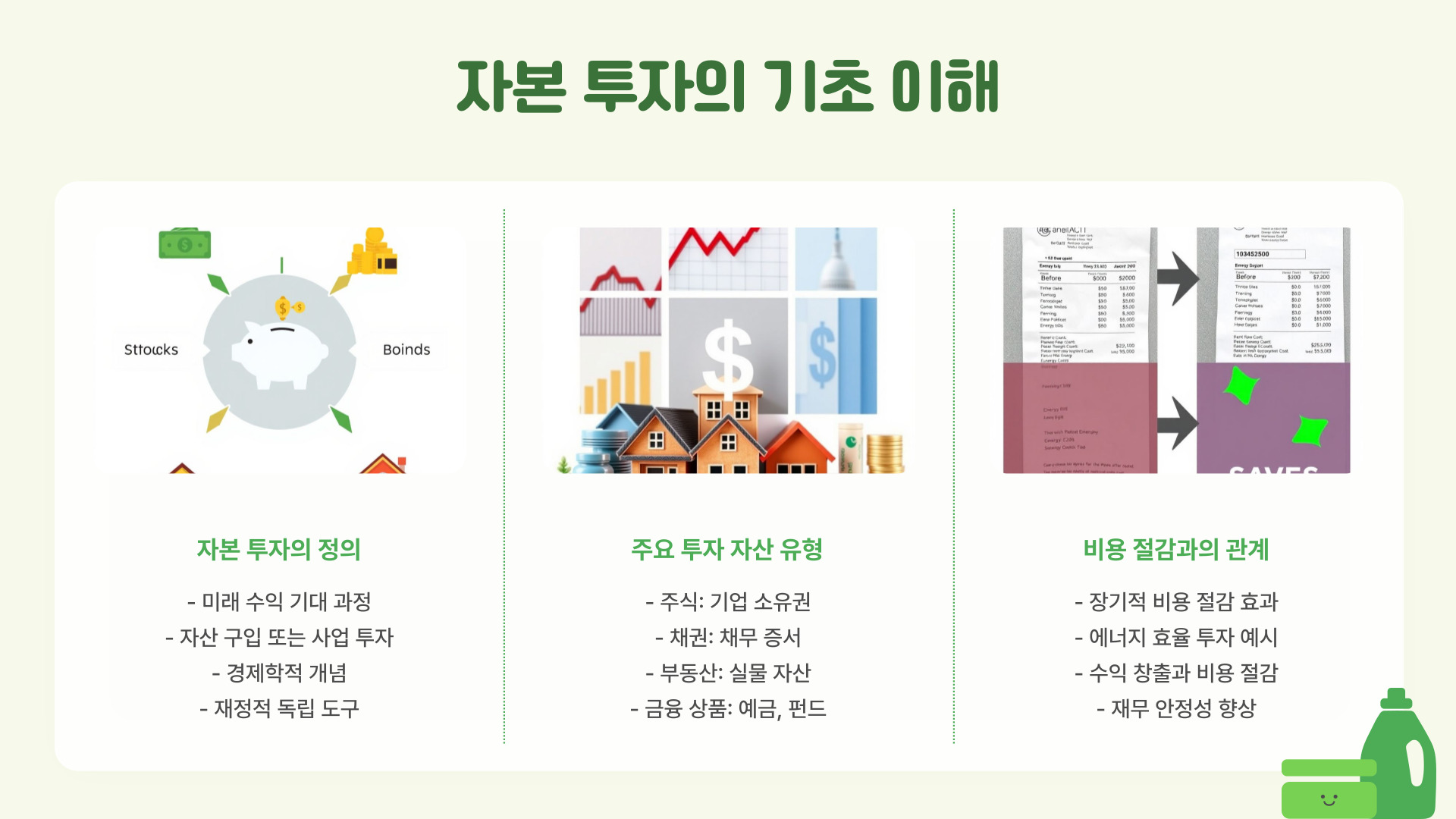자본 투자는 경제학에서 자산을 구입하거나 사업에 투자하여 미래의 수익을 기대하는 과정입니다. 처음 투자하는 사람들은 주식, 채권, 부동산 등 다양한 자산을 고려할 수 있습니다. 이들 자산에 대한 투자뿐만 아니라, 비용 절감 방법을 배우는 것도 매우 중요합니다. 예를 들어, 에너지 효율적인 장비에 투자하면 장기적으로 전기료를 절약할 수 있습니다.