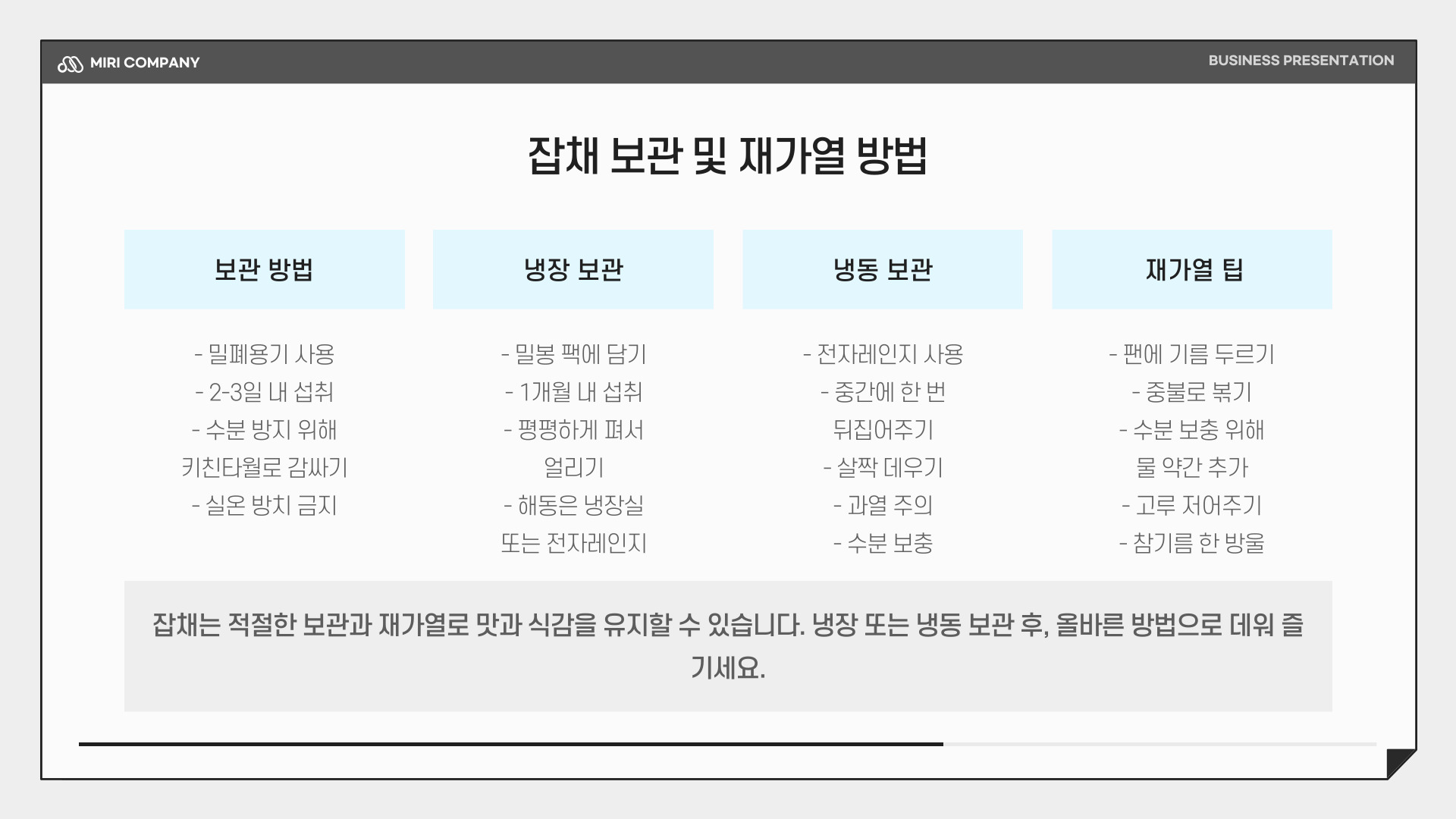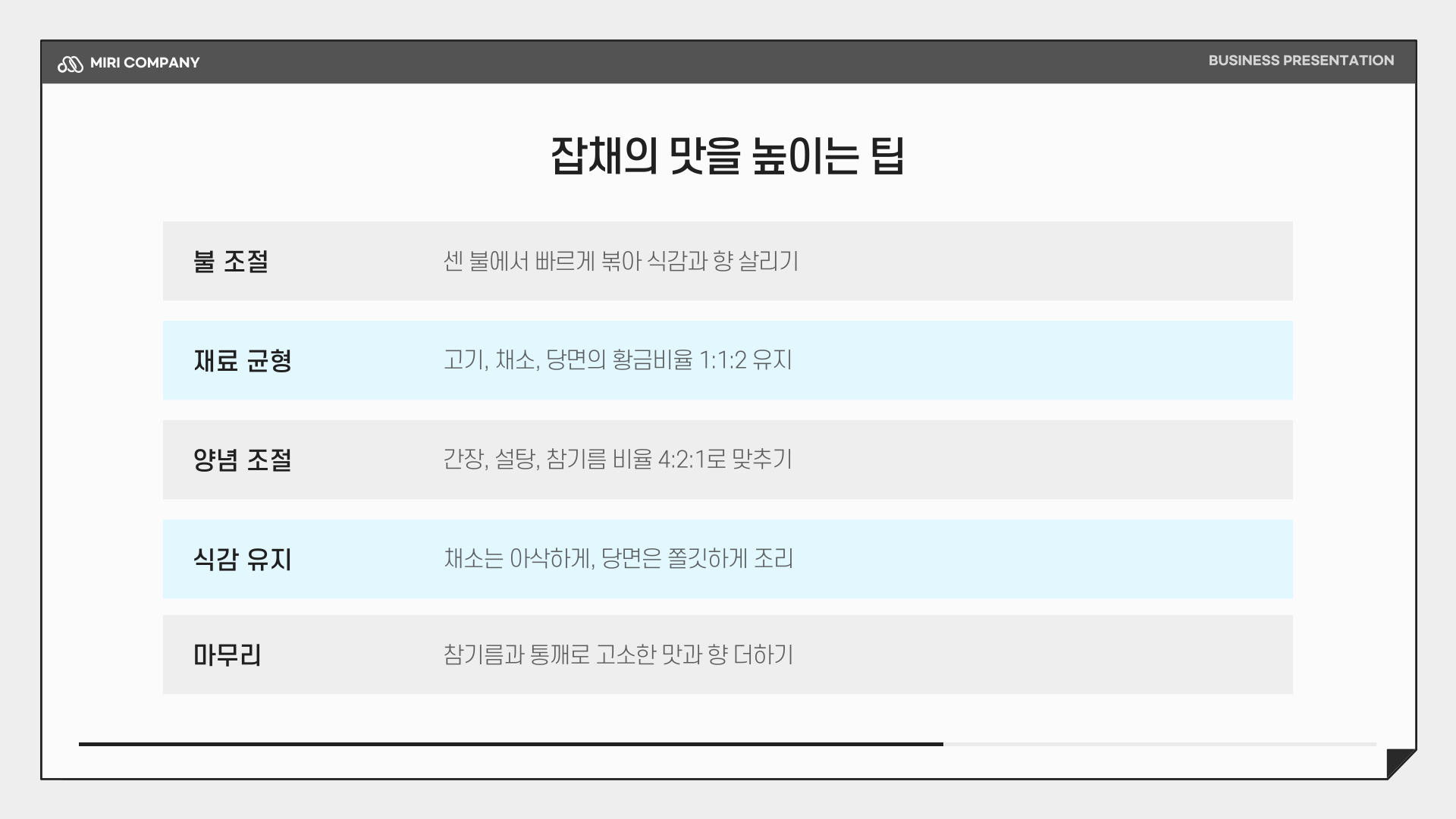 결론적으로, 잘 만들어진 잡채는 누구와 먹어도 기분 좋게 해주는 훌륭한 음식입니다. 잡채 황금레시피를 가지고 앞으로 여러 개성 있는 변형을 시도해 볼 수도 있습니다. 튀김이나 초밥 등과 함께 곁들이면 색다른 잡채 요리를 즐길 수 있습니다.