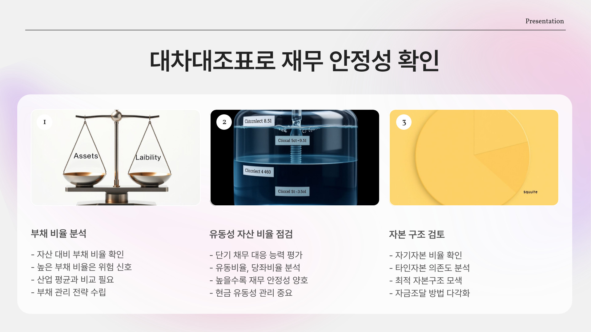 - 유동성 자산 비율: 단기 채무 대응 능력 점검