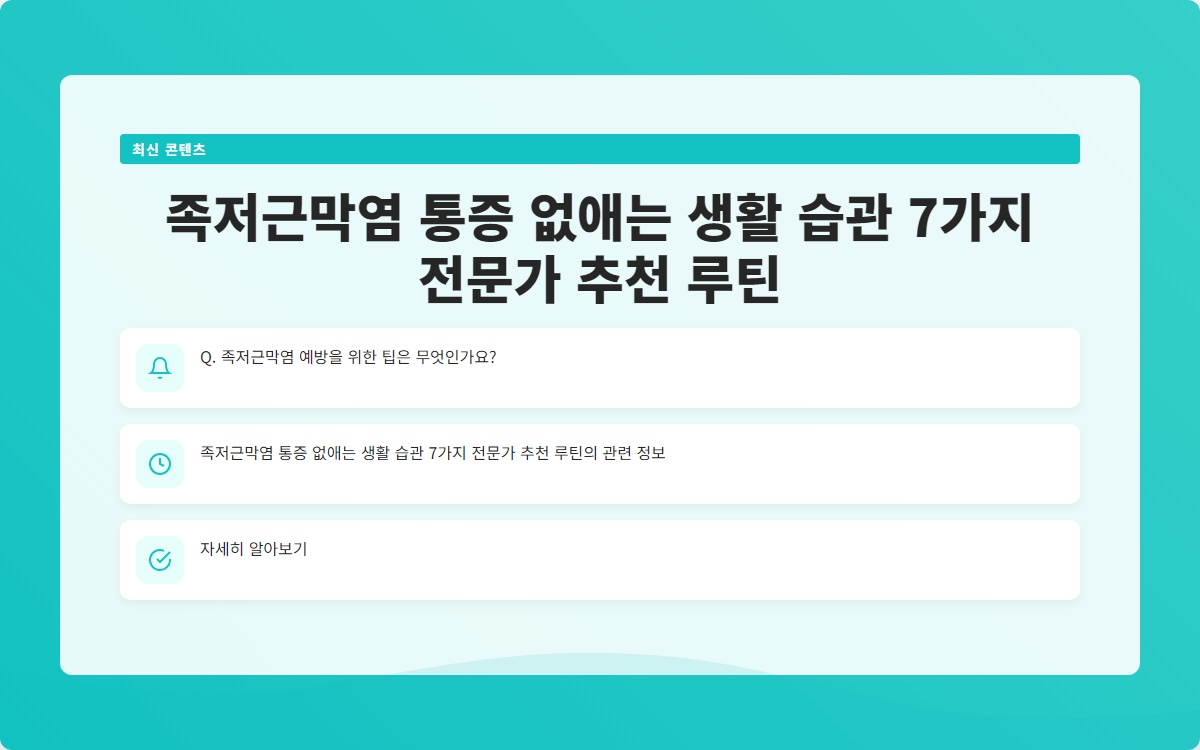 이 글을 통해 족저근막염의 원인을 파악하고, 통증을 완화할 수 있는 생활 습관을 익혀보세요. 이를 통해 통증에서 벗어나 보다 건강한 일상을 즐길 수 있습니다.