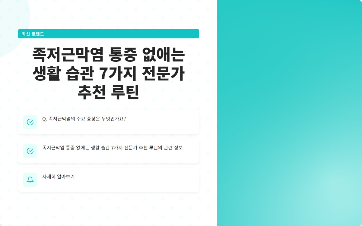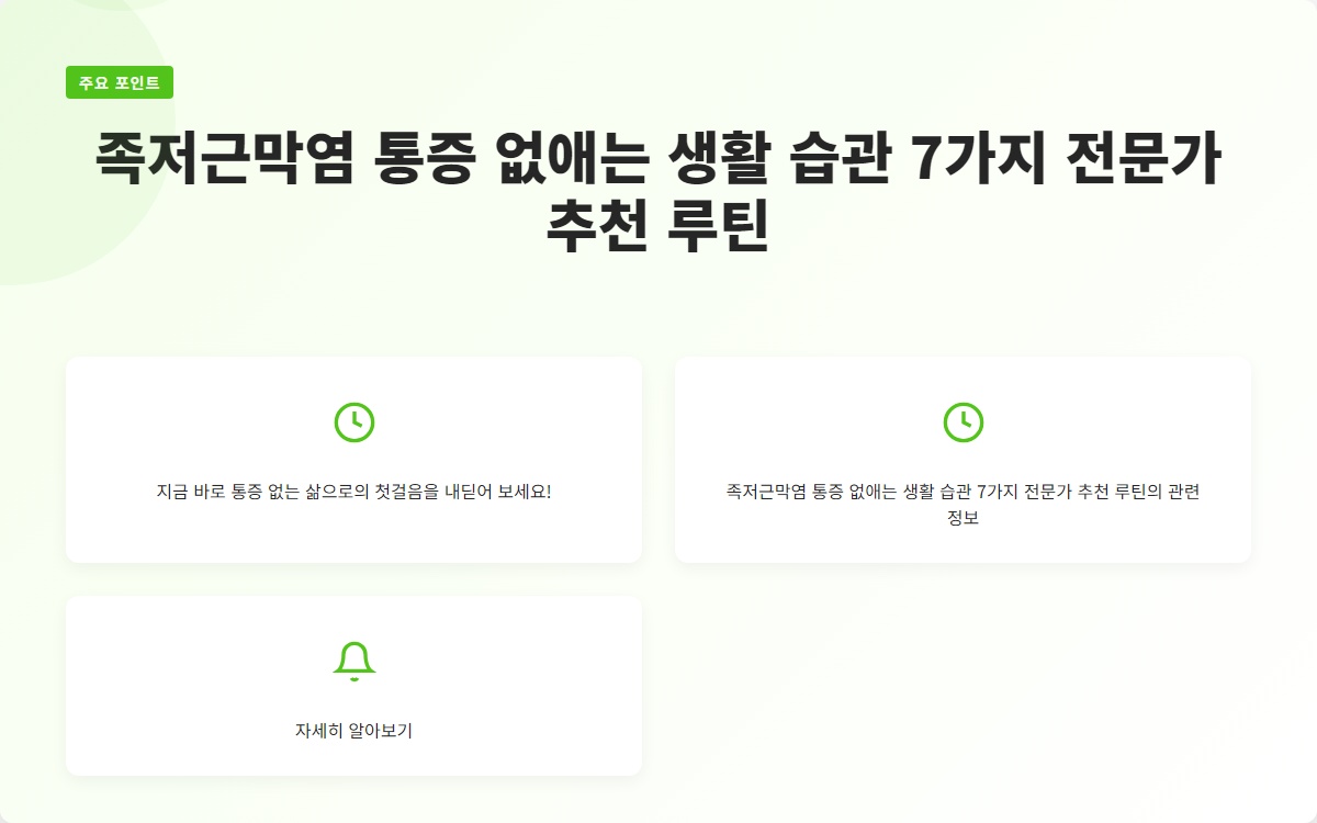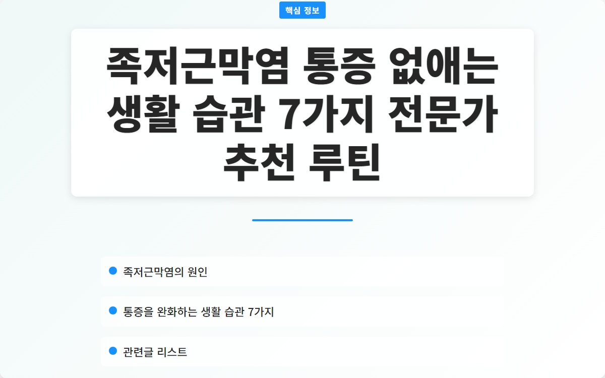 족저근막염으로 인해 매일 아침 발바닥의 통증으로 힘들어하고 계신가요? 이 통증은 단순한 불편함이 아닌, 일상 생활에 큰 영향을 미칠 수 있습니다. 그러니 이 글을 통해 통증을 완화할 수 있는 생활 습관 7가지를 알아보세요!
