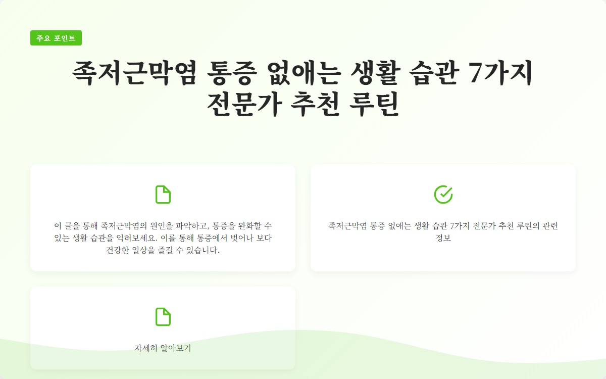 이러한 습관을 실천함으로써 족저근막염으로 인한 통증을 효과적으로 완화할 수 있습니다.