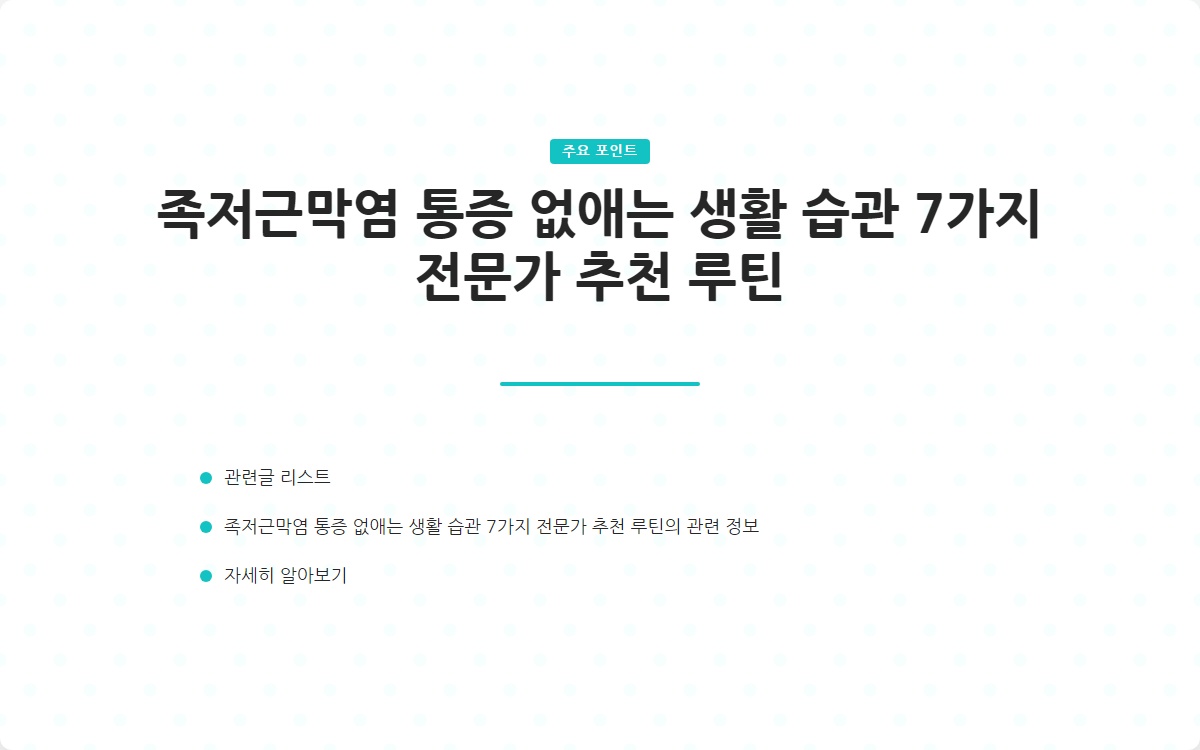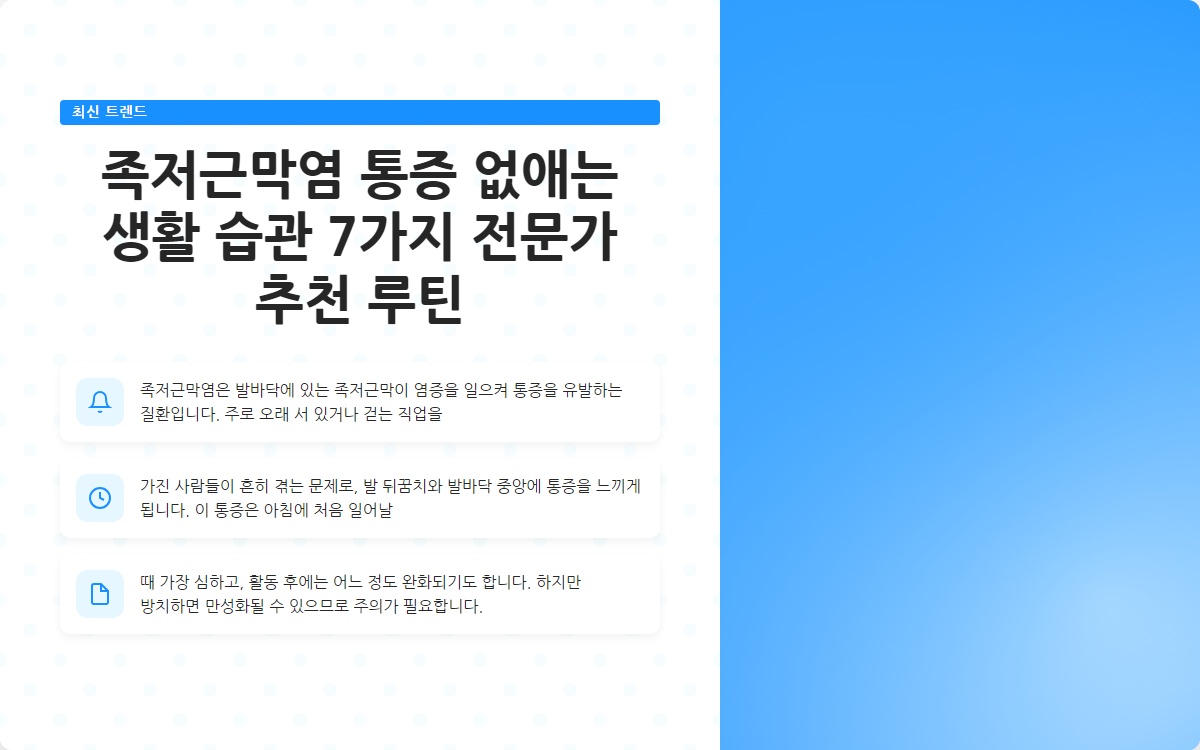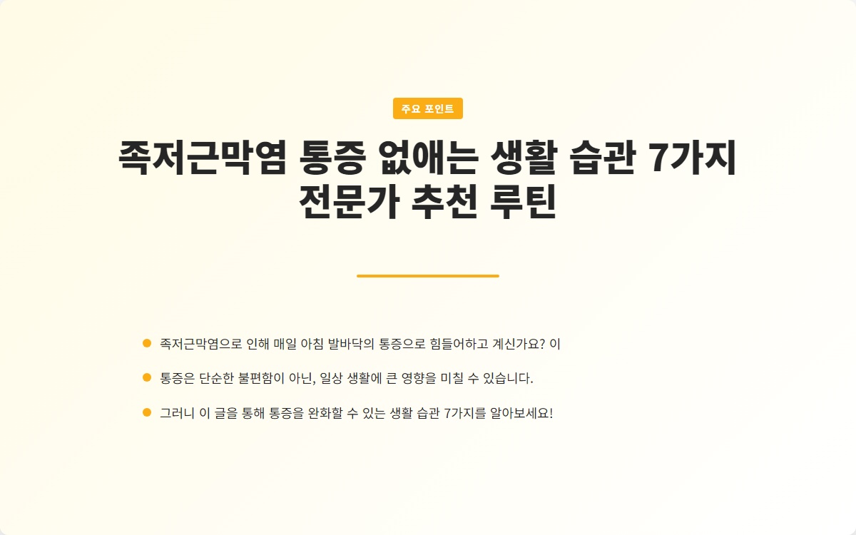 족저근막염으로 인해 매일 아침 발바닥의 통증으로 힘들어하고 계신가요? 이 통증은 단순한 불편함이 아닌, 일상 생활에 큰 영향을 미칠 수 있습니다. 그러니 이 글을 통해 통증을 완화할 수 있는 생활 습관 7가지를 알아보세요!