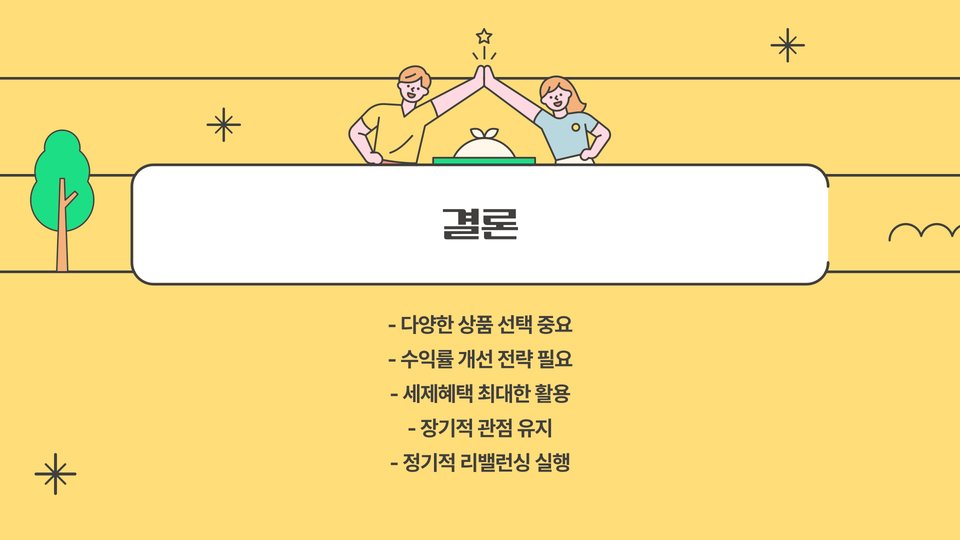 • 정기적인 점검과 리밸런싱으로 투자 성과를 극대화하세요.