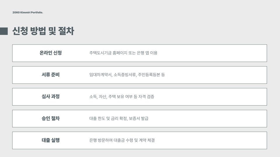 - 신청 절차: 서류 준비 → 금융기관 선택 → 대출 신청 → 심사 → 대출 승인