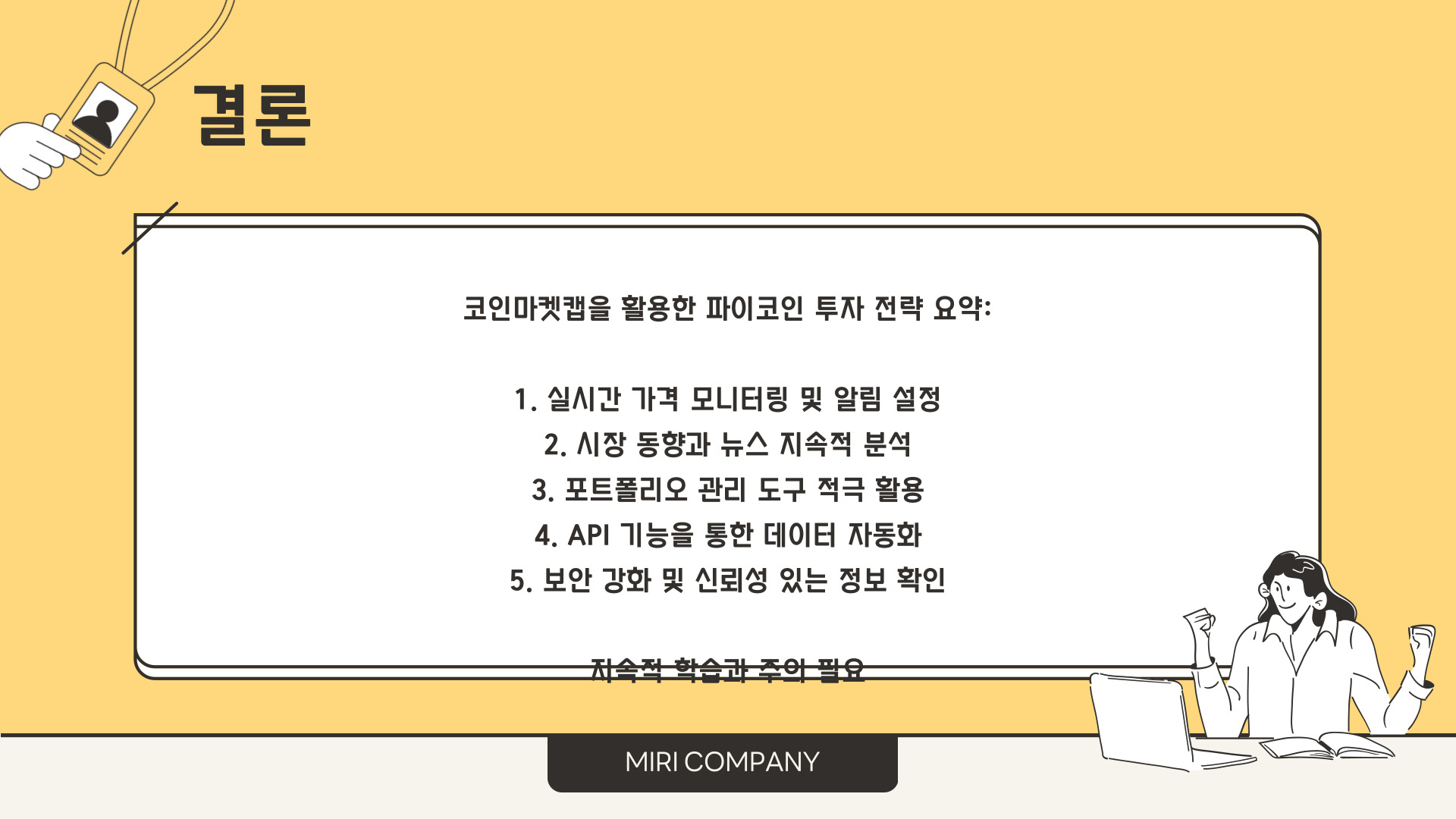 결론적으로, 코인마켓캡에서 파이코인을 더욱 효과적으로 활용하기 위해서는 시장 동향을 이해하고, 효율적인 거래 전략을 수립하며, 커뮤니티에 적극적으로 참여하는 것이 중요합니다. 이러한 접근 방식을 통해 귀하의 투자 성공을 한 단계 높일 수 있을 것입니다.