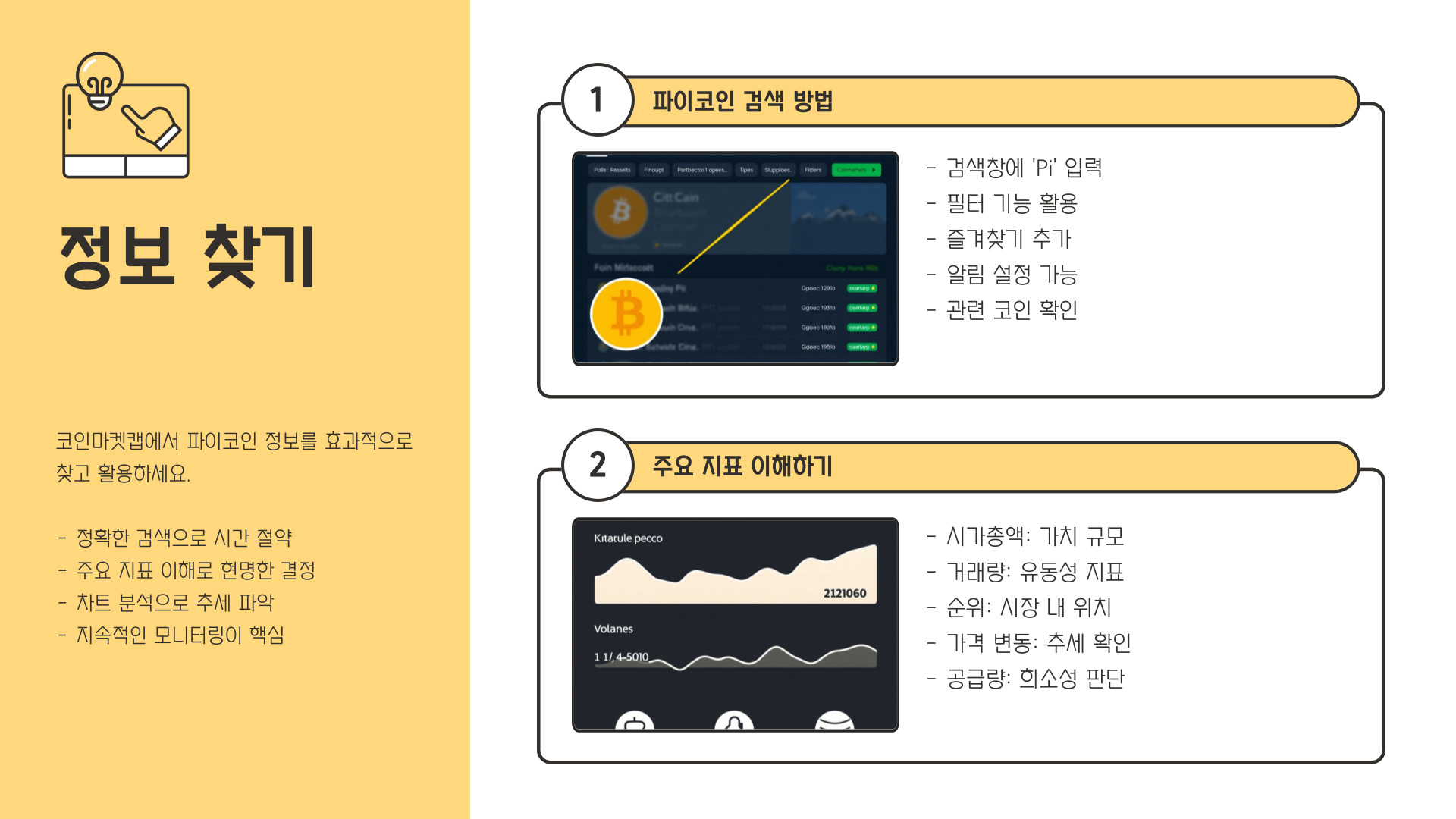 - 거래량 및 시가총액 주의 깊게 살펴보기