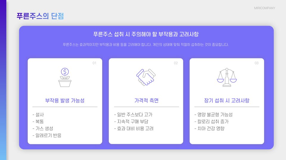푸른주스의 단점은 여러 가지가 있으며, 이를 잘 이해하고 섭취해야 합니다. 예를 들어, 과다 섭취 시 위장 장애를 유발할 수 있으며, 특정 성분에 민감한 사람은 알레르기 반응을 경험할 수 있습니다. 또한, 푸른주스는 식사 대체로 사용하기에는 영양의 균형이 맞지 않을 수 있으므로, 다양한 식사를 통해 영양을 보충하는 것이 중요합니다.