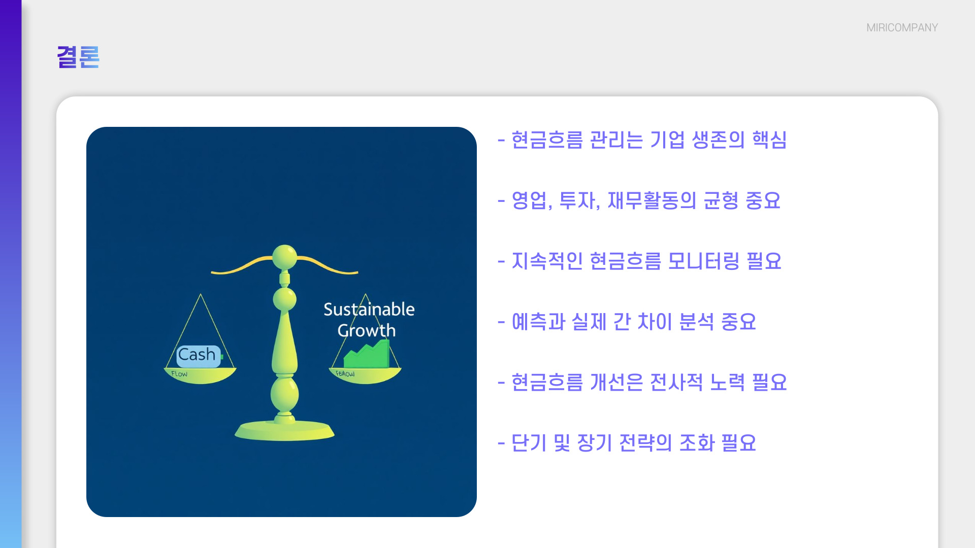 결론적으로, 잦은 분석과 관리로 현금 흐름을 유지하는 것은 비즈니스를 안정적으로 운영하는 데 이바지합니다. 하나의 큰 실패로부터 오는 재정적 시련은 향후 비즈니스 운영에 심각한 영향을 미칠 수 있기 때문입니다. 따라서 현금 흐름 관리에서는 운영, 투자, 재무 각 측면에서 항상 주의가 필요합니다.