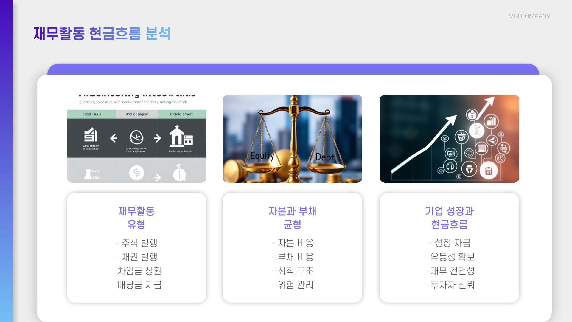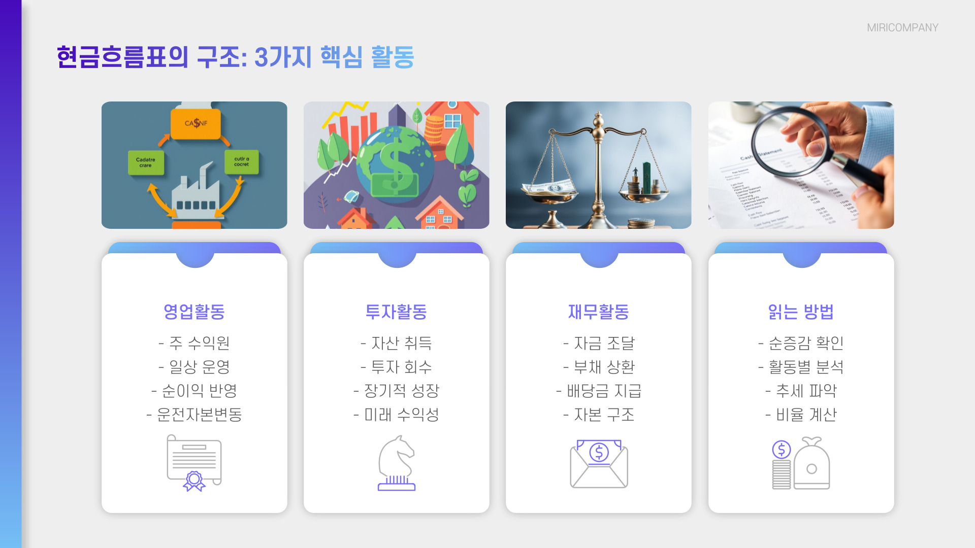 - 현금 흐름은 운영, 투자, 재무 세 가지 유형으로 나뉜다.