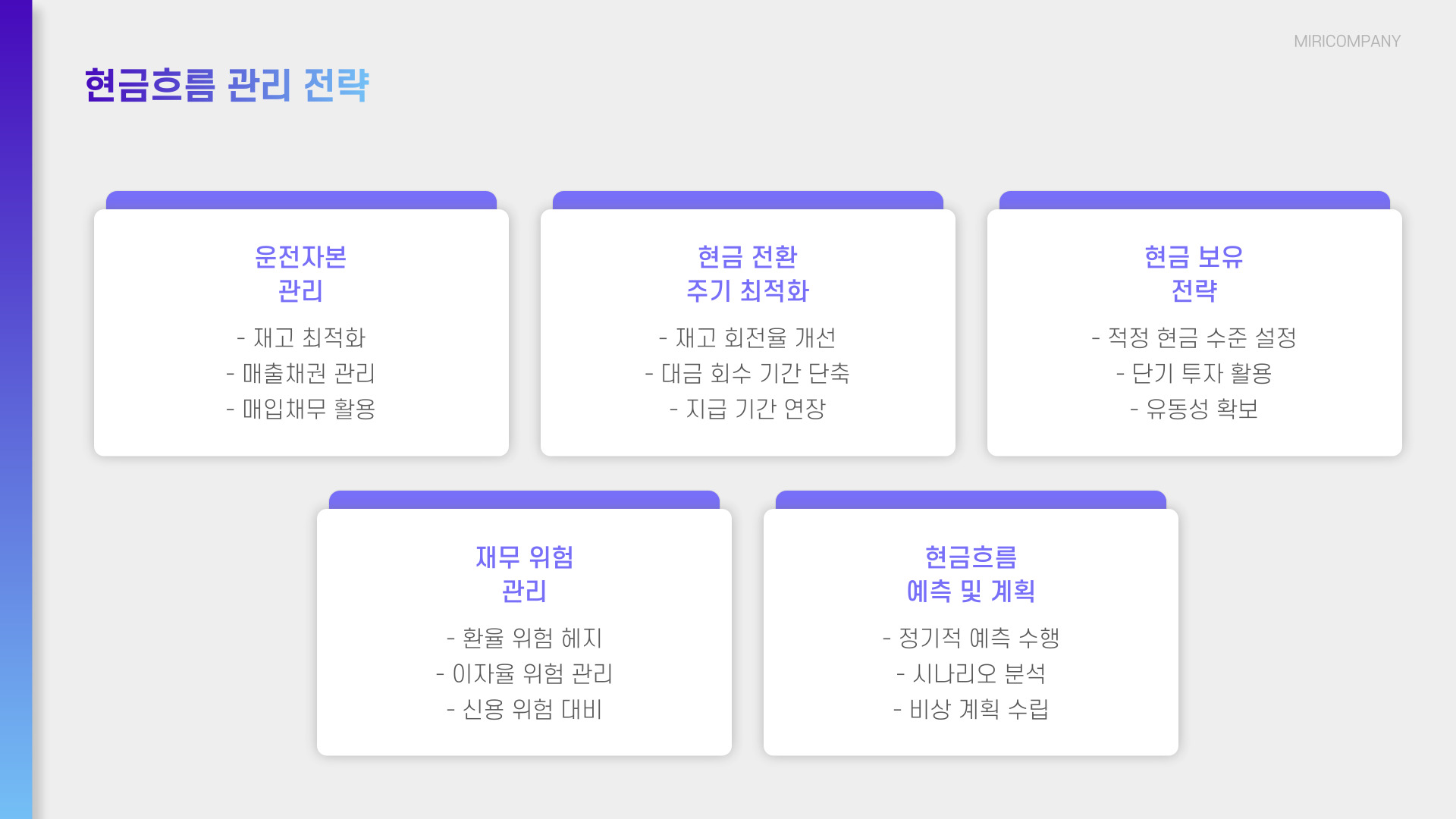 - 예산 편성, 고객의 지불 조건 조정, 비용 절감이 현금 흐름 개선에 도움을 준다.