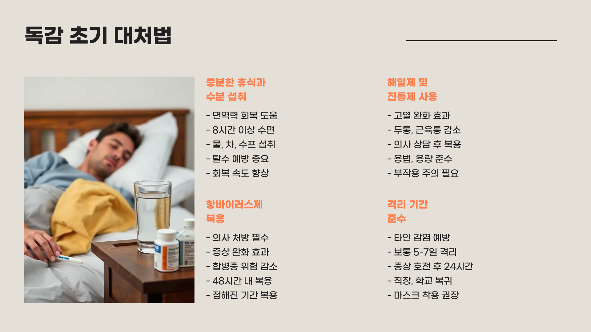 독감 초기증상이 나타났을 때는, 즉시 의사와 상담하여 적절한 치료를 받는 것이 중요합니다. 자기 진단보다는 전문가의 지시를 따르는 것이 회복에 더 큰 도움이 됩니다. 충분한 휴식과 수분 섭취는 회복에 큰 기여를 합니다.