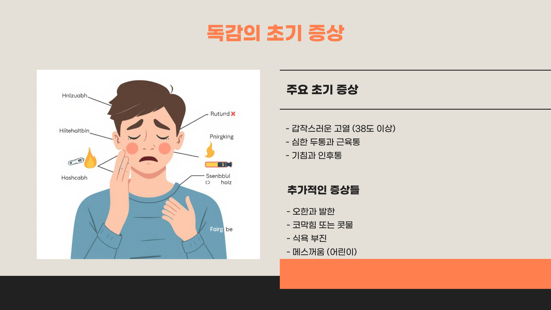 독감의 초기증상은 여러 가지가 있으며 주로 고열, 기침, 인후통 등이 대표적입니다. 이 증상들은 다른 호흡기 질환과 유사하여 구별하기 어려울 수 있지만, 독감은 갑작스럽게 발생하는 특징이 있습니다. 대개 아침에 잘 일어나고 오후에 갑자기 몸이 아픈 것이 특징입니다.