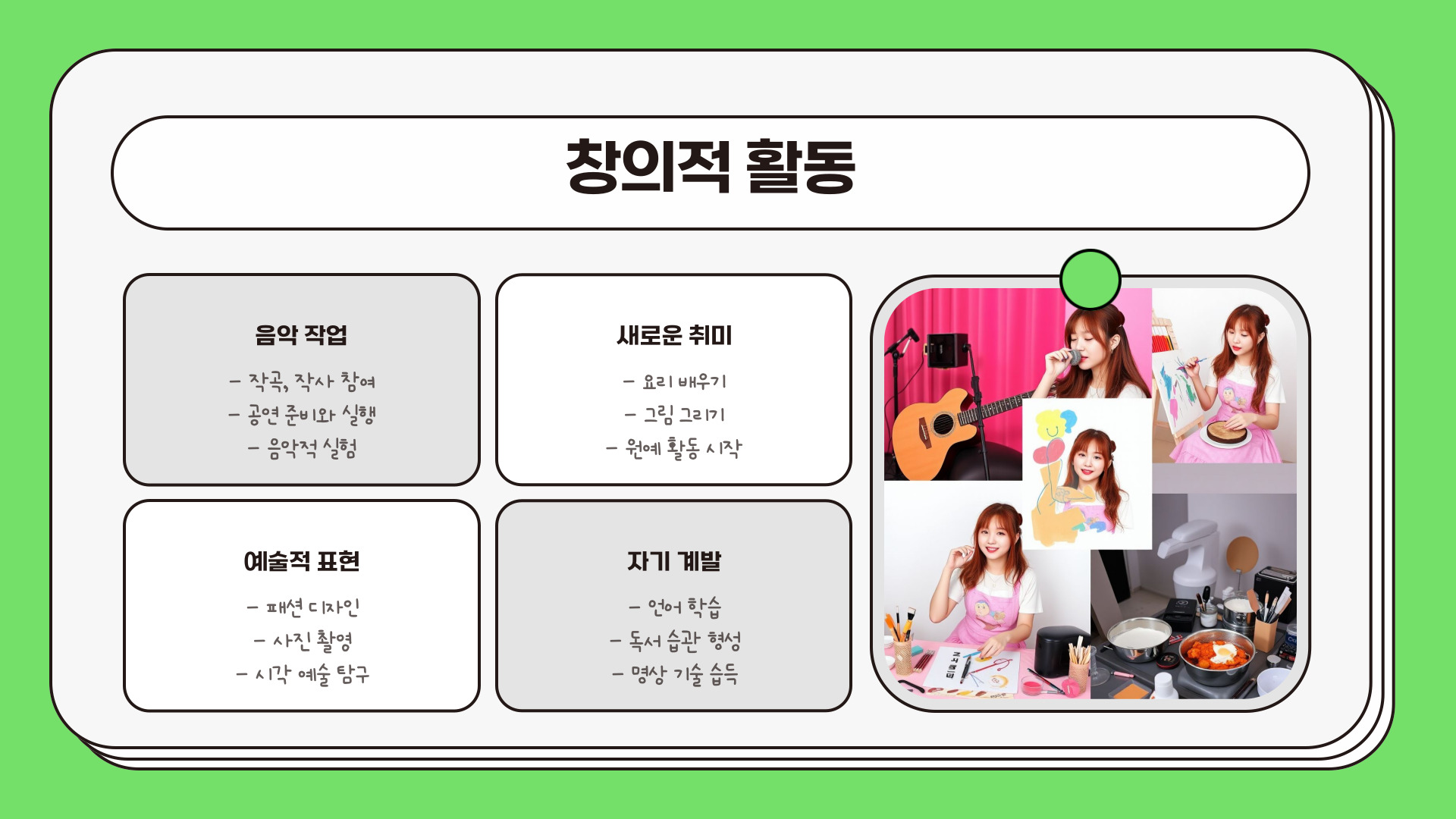 창의적 활동 음악이나 그림 등을 통해 감정 표현