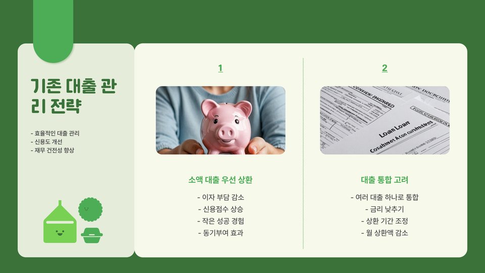셋째, 신용 점수를 향상시키기 위한 방법을 모색해야 합니다. 신용카드 사용 내역을 관리하고, 연체를 피하며, 다양한 금융 거래를 통해 신용 점수를 높일 수 있습니다. 마지막으로, 필요한 금액을 정확히 계산하여 과도한 대출을 피하는 것이 좋습니다.