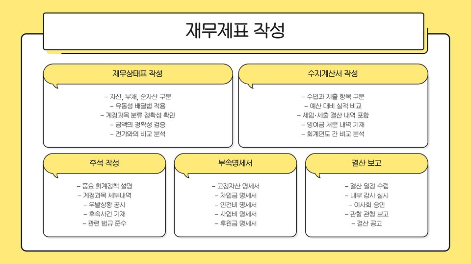 | 재무 보고서 작성 | 정기적으로 대차대조표 및 손익계산서를 작성해야 합니다. |