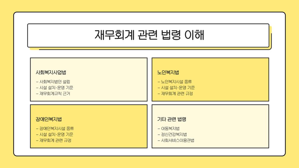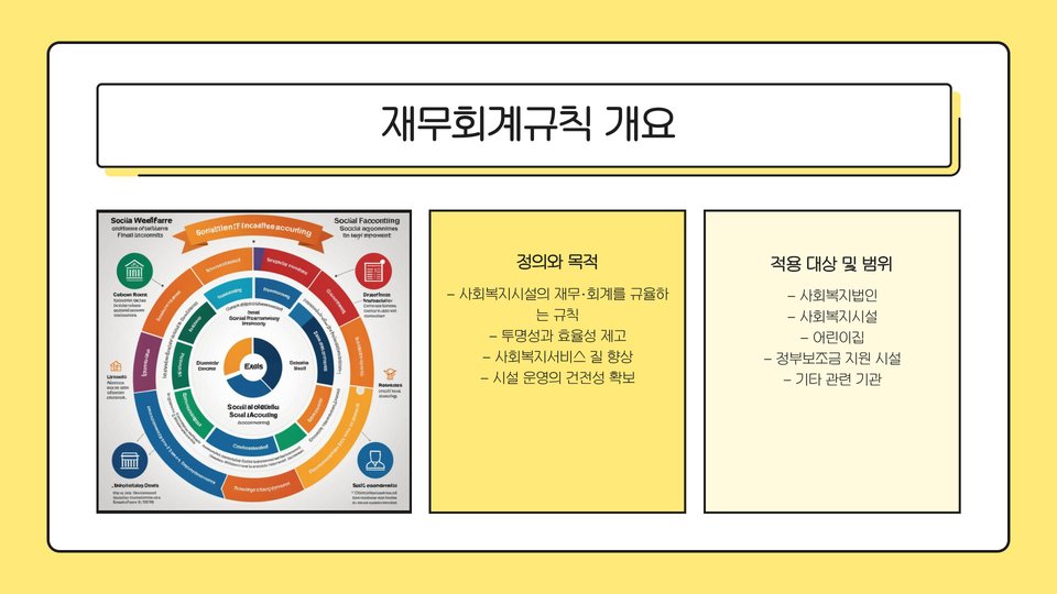 사회복지시설 재무회계규칙은 사회복지기관이 재무관리를 투명하고 효율적으로 수행하기 위한 기본적인 지침을 제공합니다. 이 규칙은 재무회계의 원칙을 명확히 하여 모든 사회복지기관이 일관되게 재무정보를 기록하고 보고할 수 있도록 돕습니다.