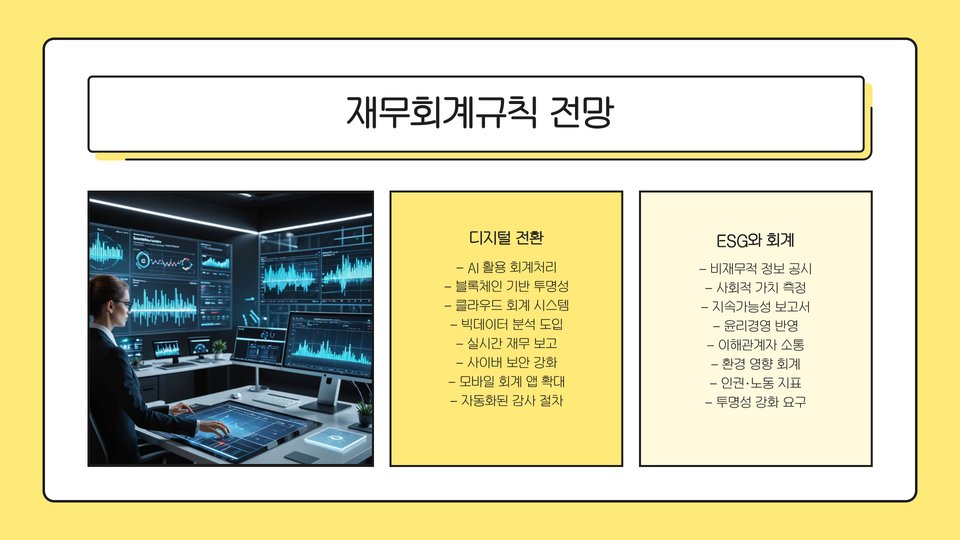 | 법규 준수 | 회계 관련 법률을 준수해야 하며, 위반 시 법적 제재를 받을 수 있습니다. |