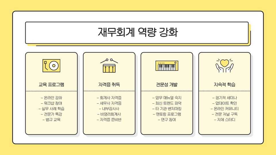 둘째, 정확한 기록 유지가 중요합니다. 모든 재무 거래는 즉시 기록되어야 하며, 이를 통해 신뢰성을 확보할 수 있습니다.